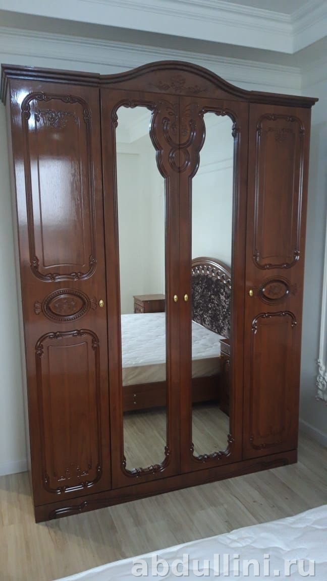 Комплект мебели Палермо выполнен в классическом стиле с элементами неоклассики. Включает кровать, две прикроватные тумбочки, комод и четырехдверный шкаф. Цвет — насыщенный коричневый, напоминающий оттенок темного дерева (вишня, орех). Поверхность — глянцевая, с резными узорами на фасадах.