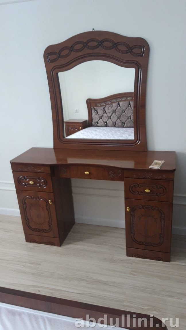 Кровать с высоким мягким изголовьем, обитым тканью (велюр или бархат) с ромбовидной стежкой. Основание под матрас — ламели. Тумбочки и комод с дверцами и выдвижными ящиками. Шкаф украшен зеркальными вставками и золотистой фурнитурой.