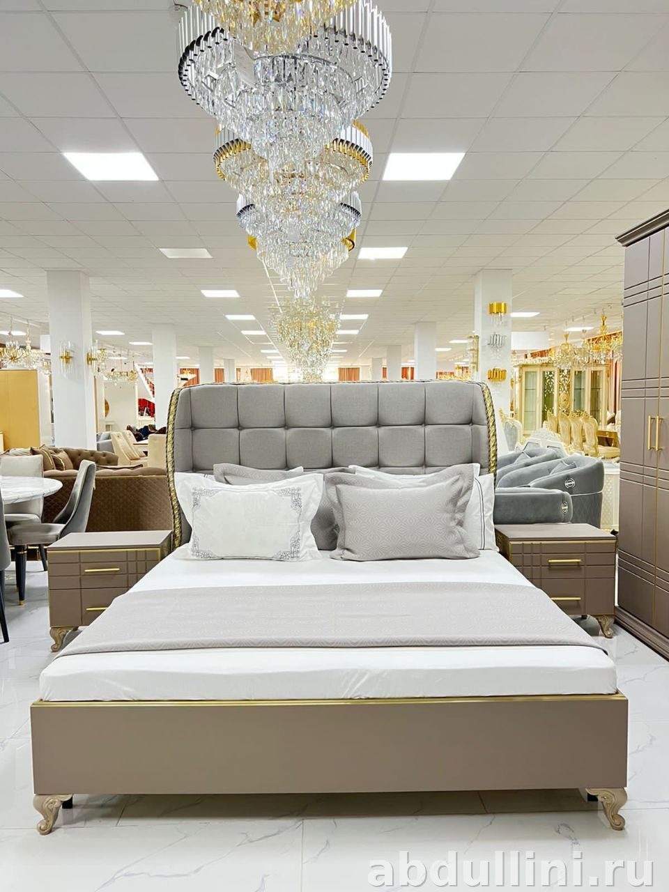 Мебельный комплект включает кровать, две прикроватные тумбочки и шкаф. Основной цвет — приглушенный серо-бежевый с теплым подтоном. Отделка матовая, декоративные элементы выполнены в золотистом цвете.