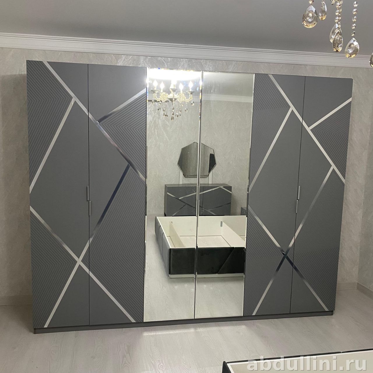 - Шкаф-купе: 6 дверей, цвет — серый. Вместительный и удобный.