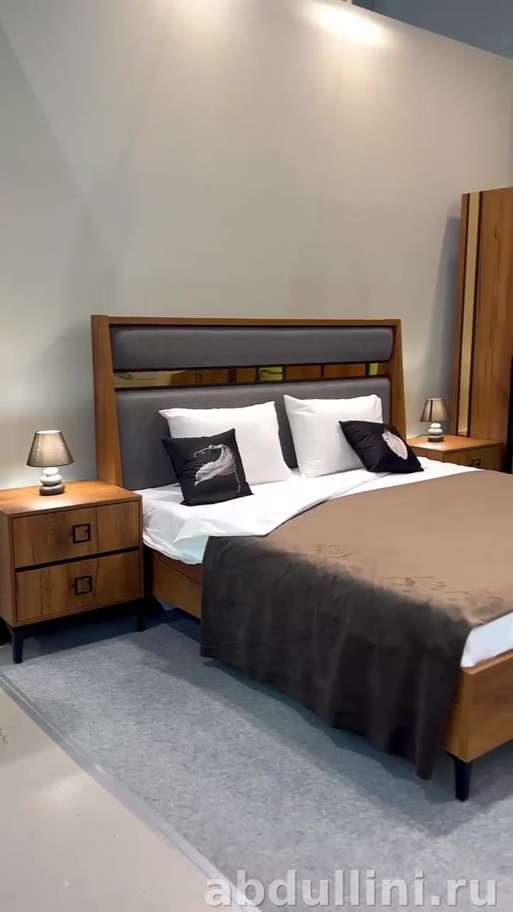Кровать с мягким изголовьем серого цвета и золотистой вставкой станет центральным элементом спальни. Шкаф трёхстворчатый, с деревянными фасадами и стеклянными вставками зеленоватого оттенка. Внутри — полочки и штанга для одежды. Комод и тумбы с квадратными ручками чёрного цвета дополняют комплект.