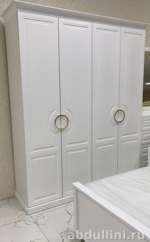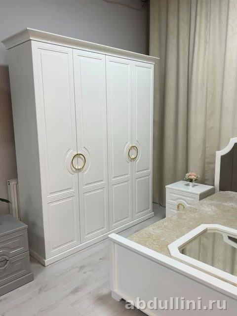 Комплект мебели для спальни в стиле неоклассика. Основной цвет – белый с глянцевой отделкой. В комплект входят: кровать с изголовьем, две прикроватные тумбочки и четырехдверный шкаф.