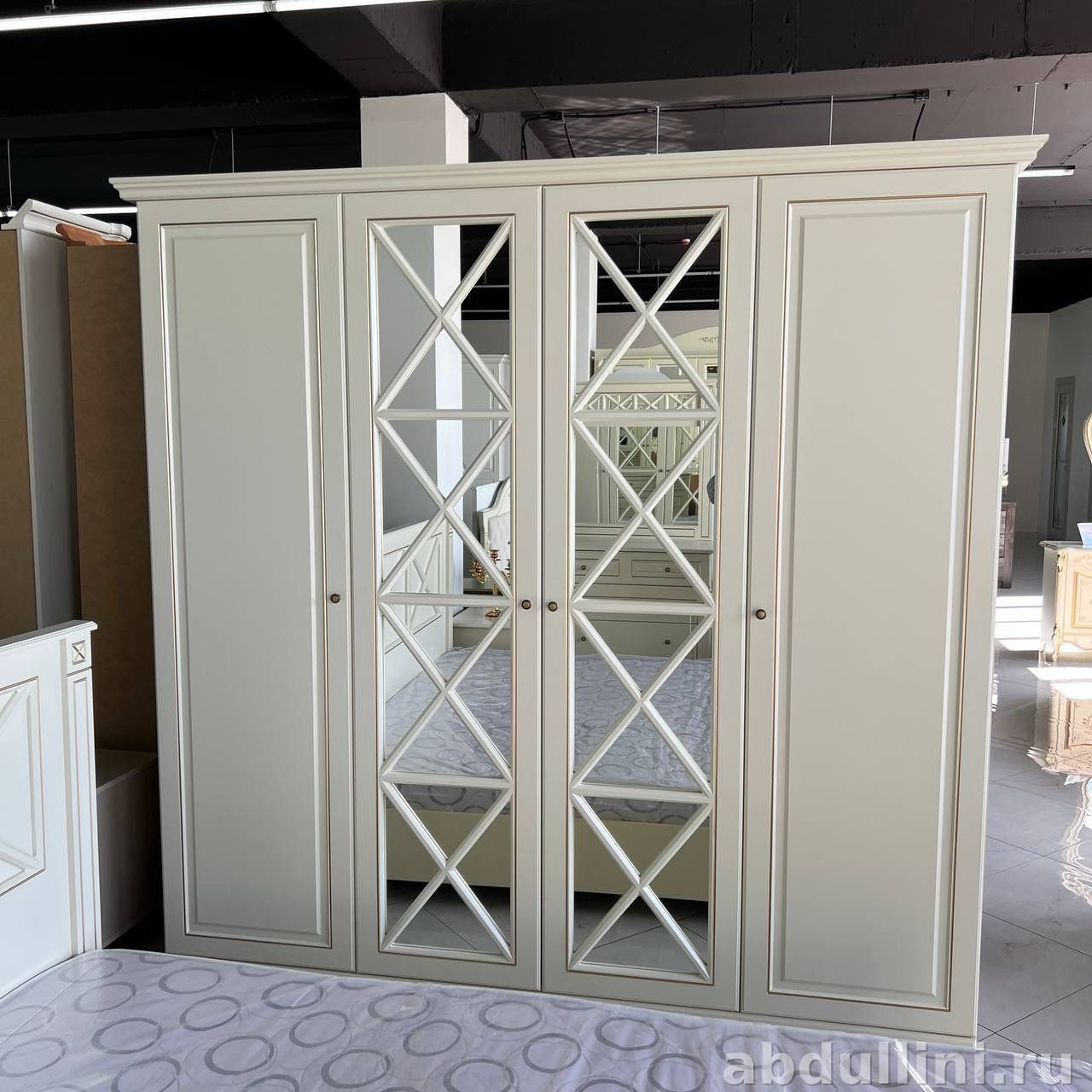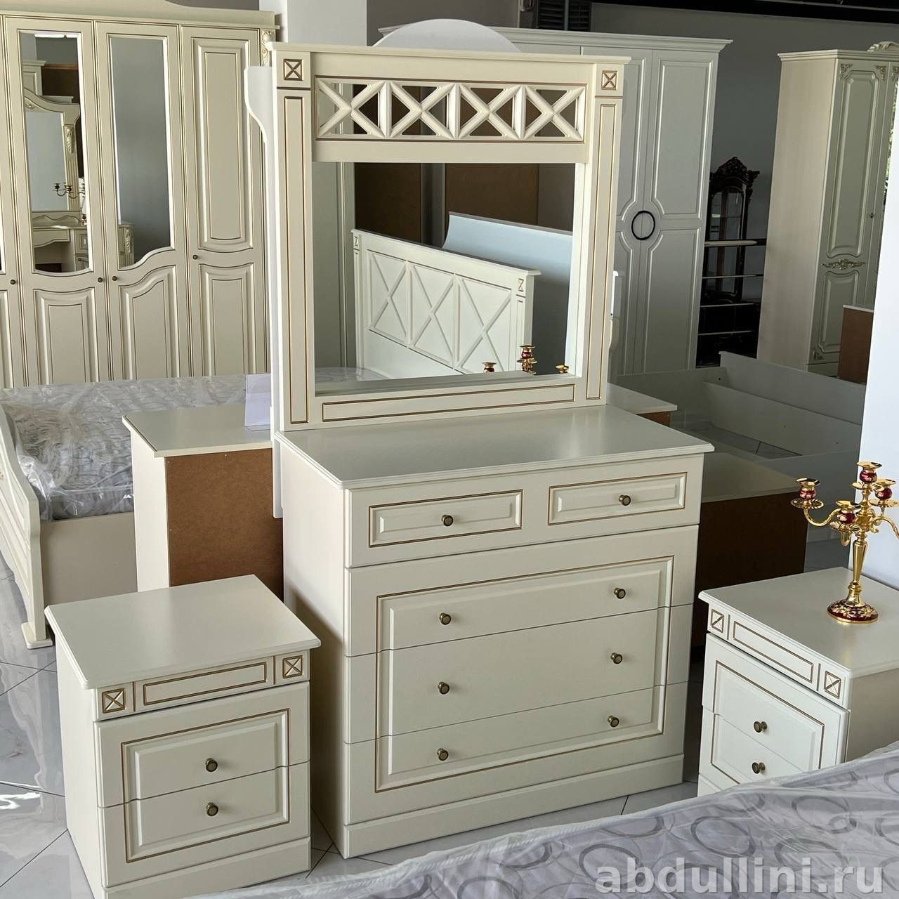 Комплект в стиле неоклассика: кровать, две тумбочки, комод с зеркалом и четырехстворчатый шкаф. Цвет — слоновая кость с золотистой отделкой. Матовая поверхность, геометрические узоры на фасадах.