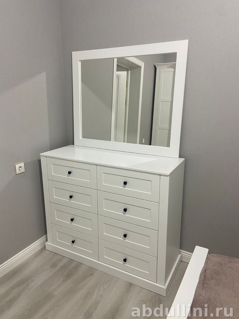 - Комод: четыре ящика, черные круглые ручки, зеркало в прямоугольной раме.