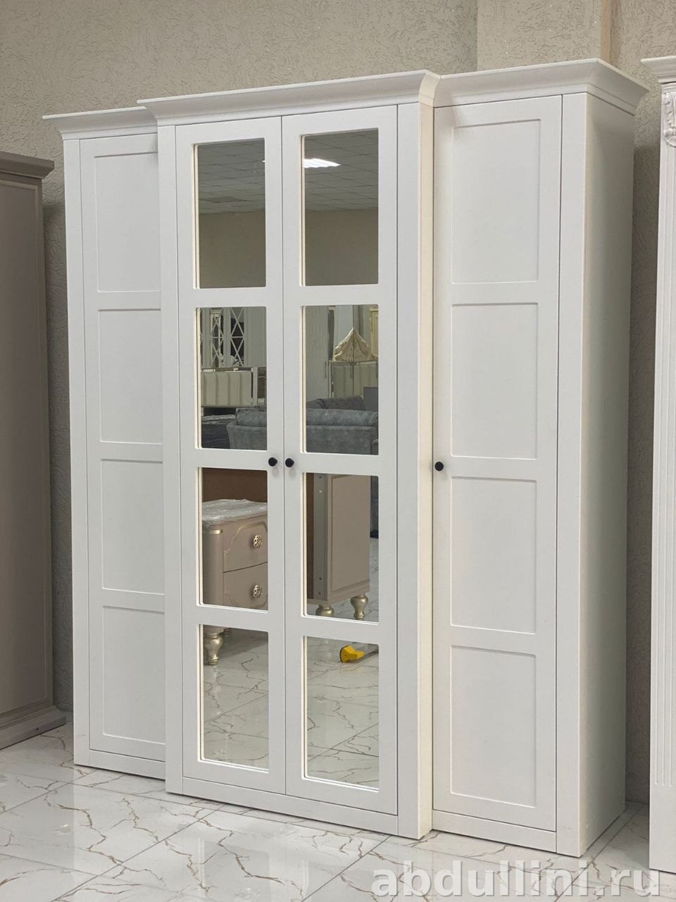 Материал — МДФ или ЛДСП с покрытием эмалью или пленкой, что обеспечивает долговечность и простоту в уходе. Стиль — модный, с элементами неоклассики, подойдет для любого интерьера.