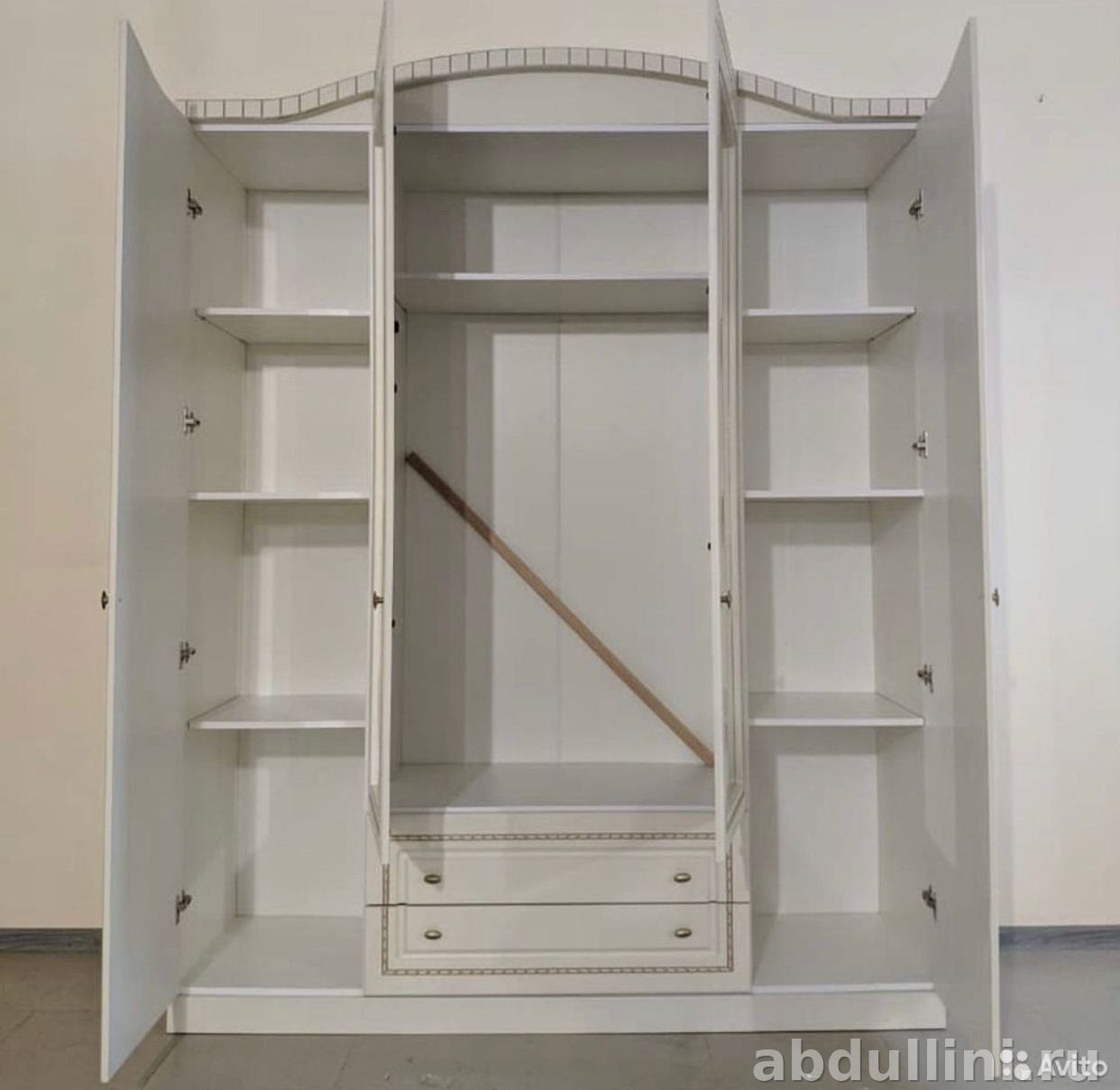 - Шкаф: 185×232×52 см, две зеркальные дверцы, полки, ящики и штанга для вешалок.