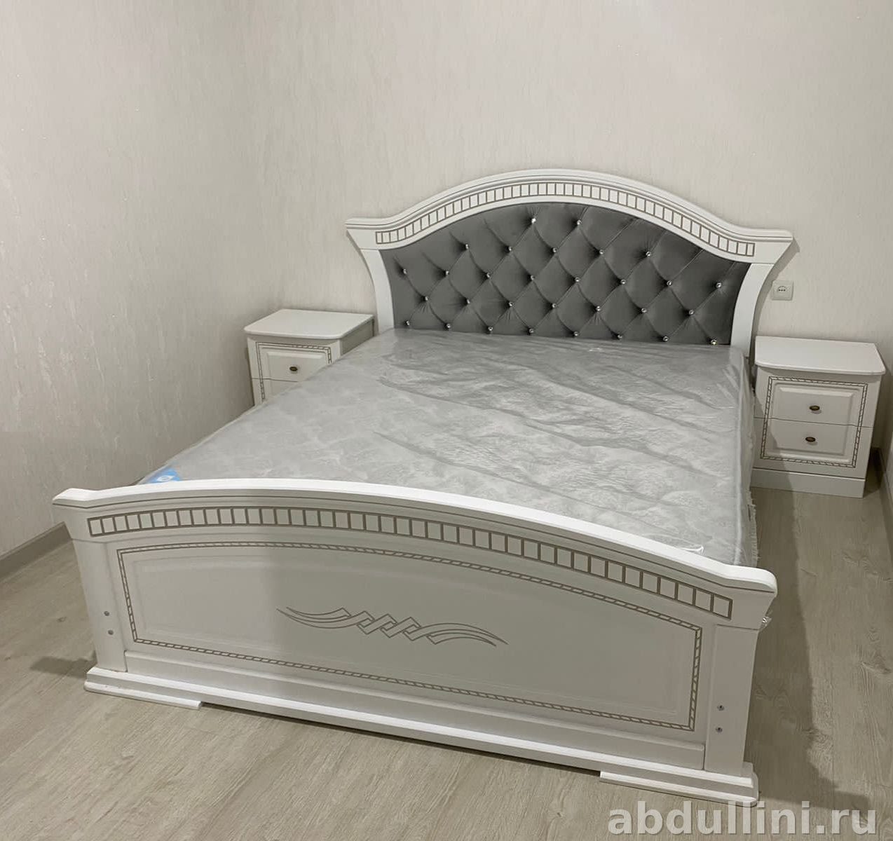 Комплект мебели для спальни в стиле неоклассика. Произведено в Ставрополе. Основной цвет — белый матовый, отделка — серебристый геометрический орнамент. В комплект входят кровать, две тумбочки, комод и шкаф.