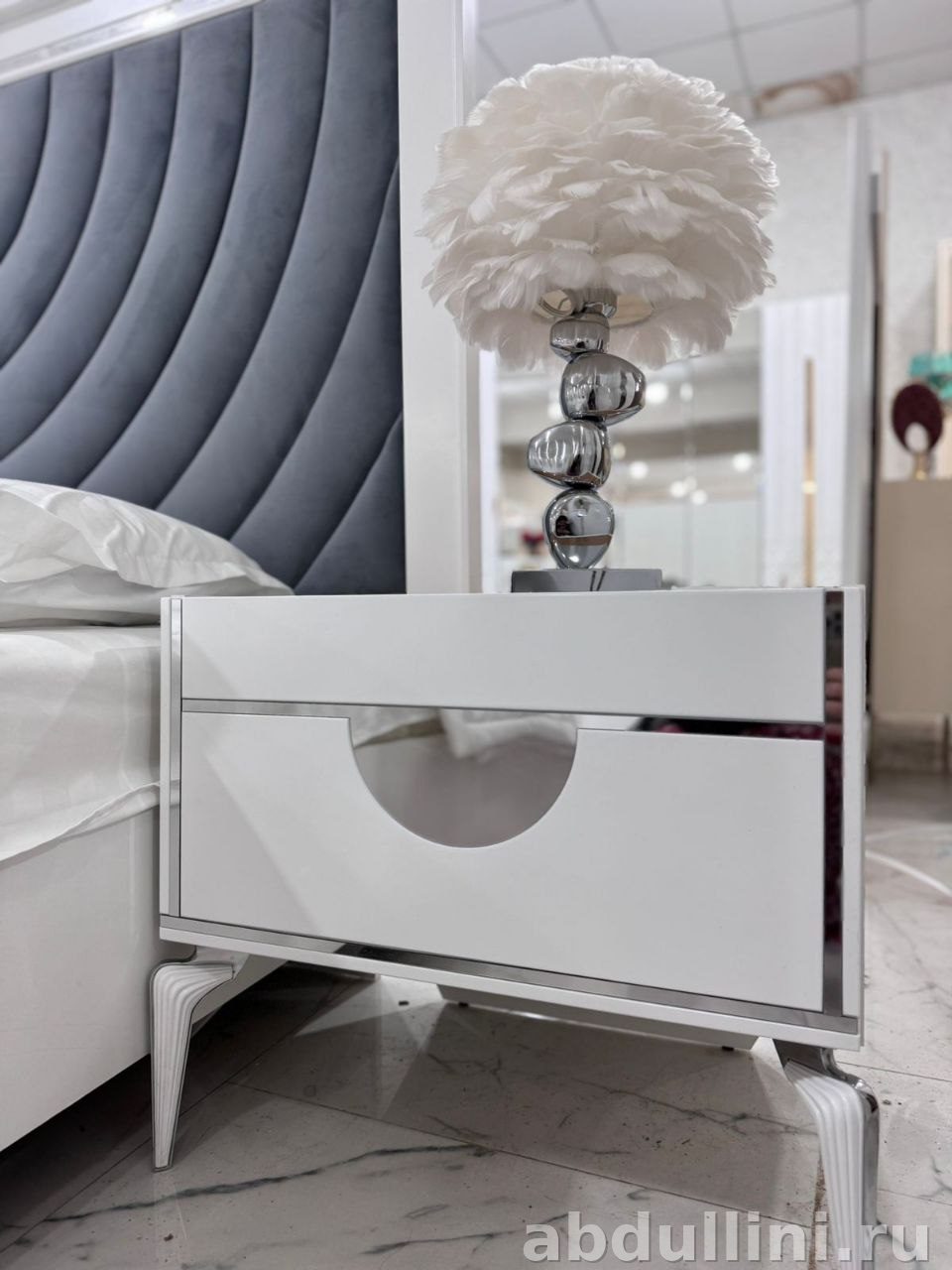 Готовый комплект мебели для спальни в современном стиле. Включает кровать с мягким изголовьем, две прикроватные тумбы и туалетный столик с пуфом. Цветовая гамма — белый с темно-синими акцентами.
