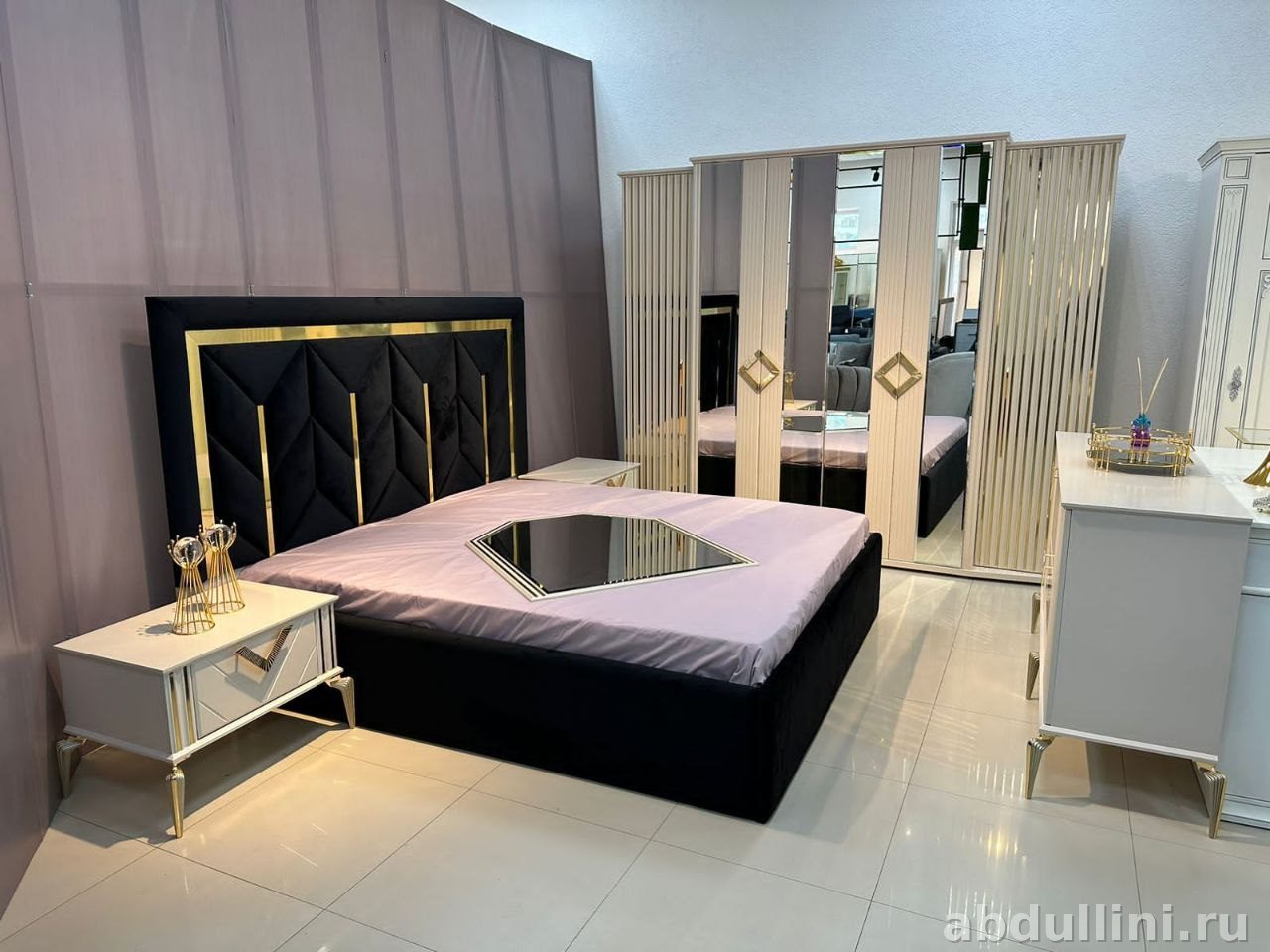 модный мебельный комплект для спальни, выполненный в стиле неоклассика. Включает кровать, две тумбочки, шкаф-купе и комод. Мебель сочетает глубокий черный цвет с кремовыми оттенками и золотистыми декоративными элементами.