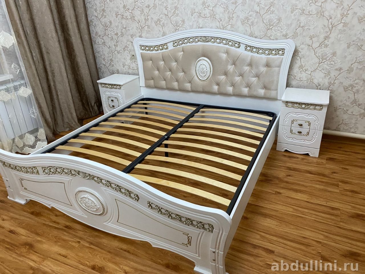 - Особенности: ламели под матрас, зеркальная дверь шкафа, выдвижные ящики с золотыми ручками