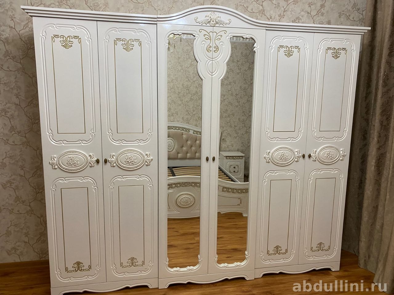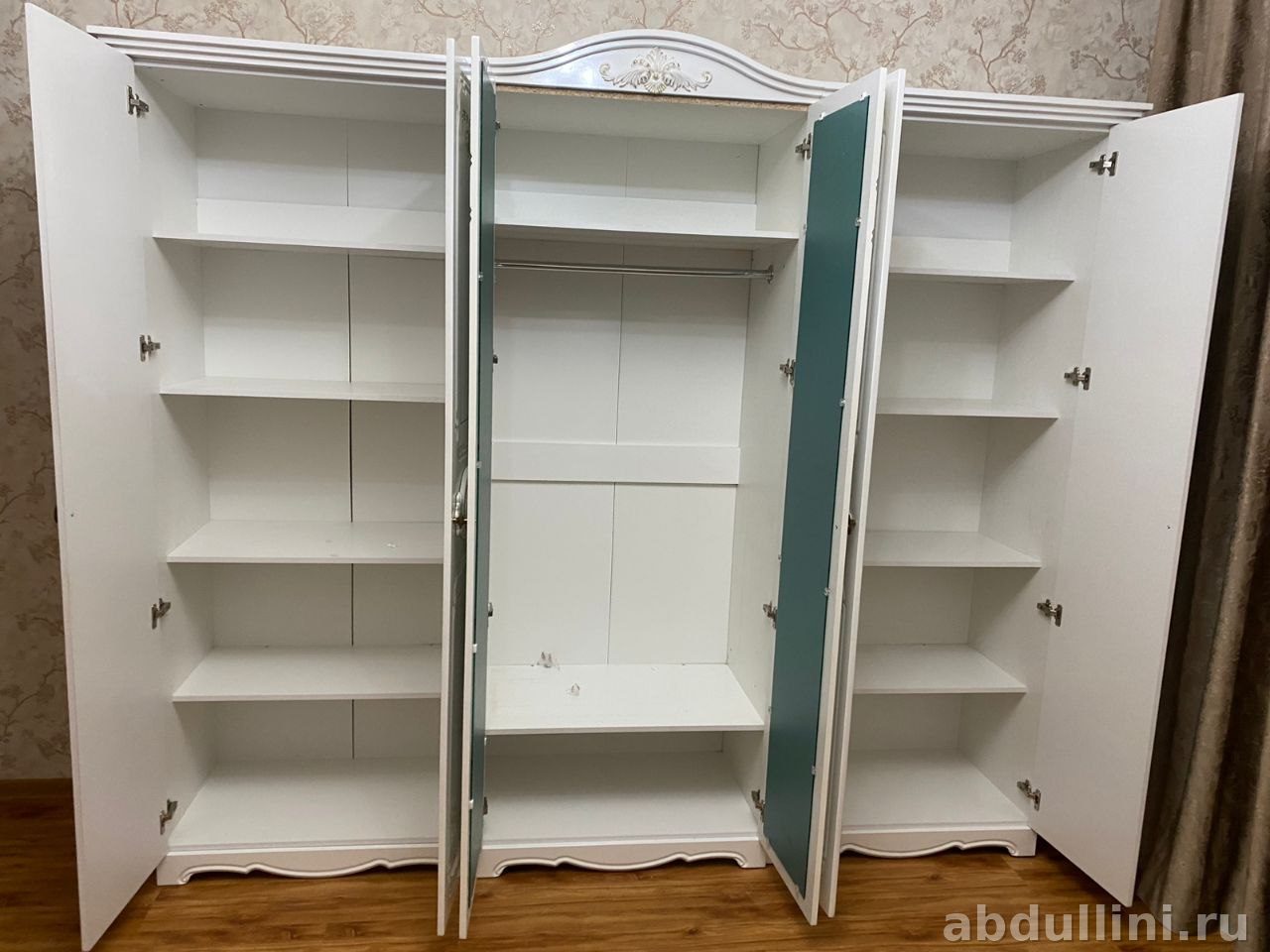 Мебель собрана без зазоров — видно по фото. Стол и тумбы с одинаковым декором. Шкаф — 5 дверей (одна зеркальная), внутри полки и штанга.