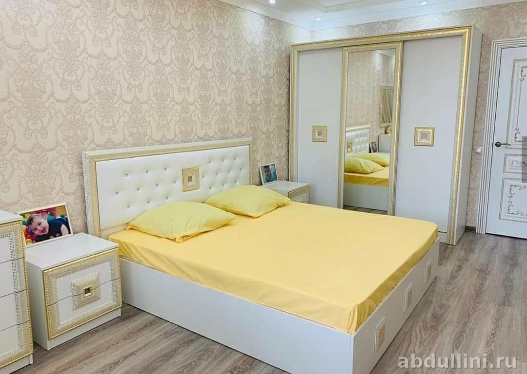 Готовый комплект для спальни в белом цвете с золотистой отделкой. Входит всё необходимое: кровать с высоким изголовьем, две тумбочки, комод с зеркалом и шкаф-купе. Мебель собрана в красивый ансамбль — не нужно подбирать элементы отдельно.