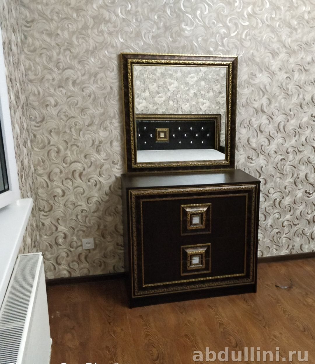 - Туалетный столик с зеркалом — встроенное зеркало в раме под стиль комплекта.