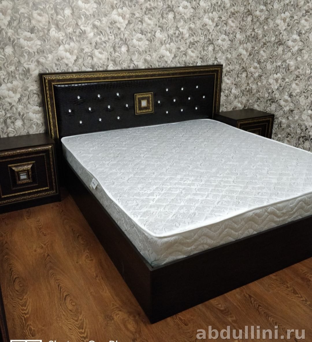 - Кровать с мягким изголовьем — декоративные элементы с золотистой окантовкой.
