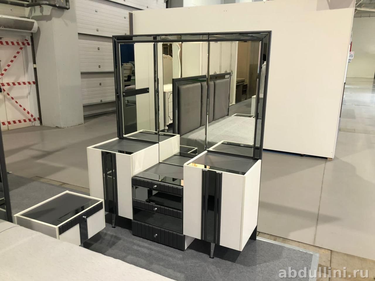 - Трельяж: размеры 1520x470x1740 мм. Туалетный столик с выдвижными ящиками и зеркалом.