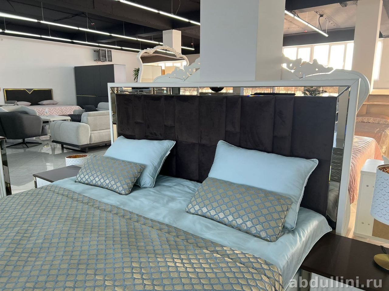 - Кровать: основание из ЛДСП/МДФ (глянец), изголовье обито велюром с вертикальной стежкой. Размер спального места — 180×200 см.