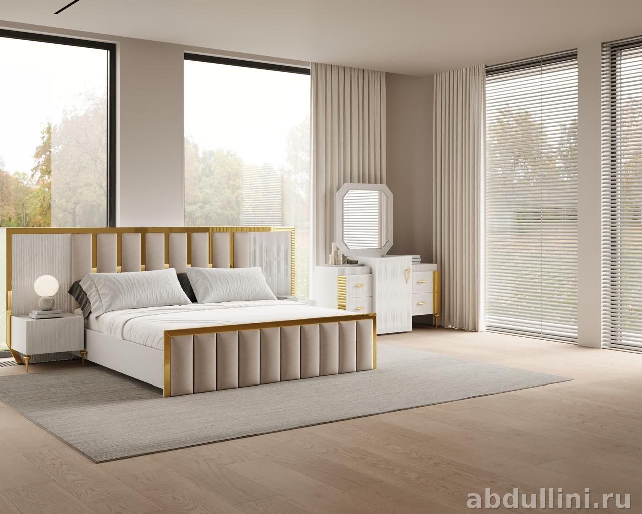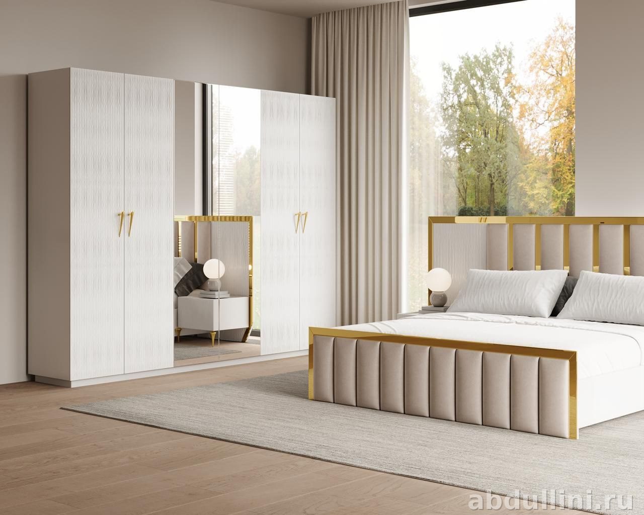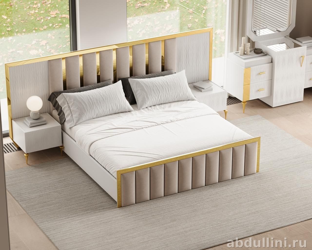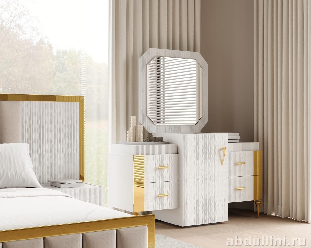 Мебельный комплект для спальни в белом цвете с золотыми акцентами. Произведено в Краснодаре, доставка по всему Дагестану. В комплект входит всё необходимое для комфортной спальни.