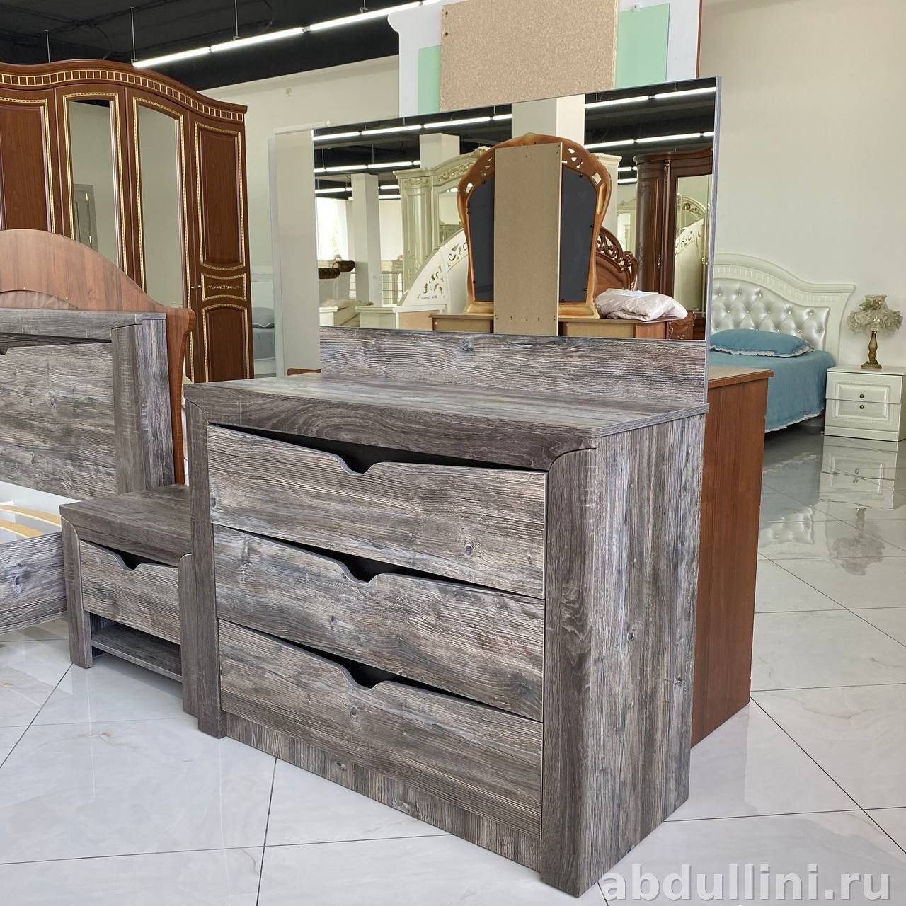- Комод 107×44×83 см — три выдвижных ящика с интегрированными ручками.