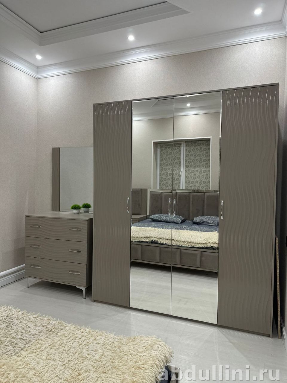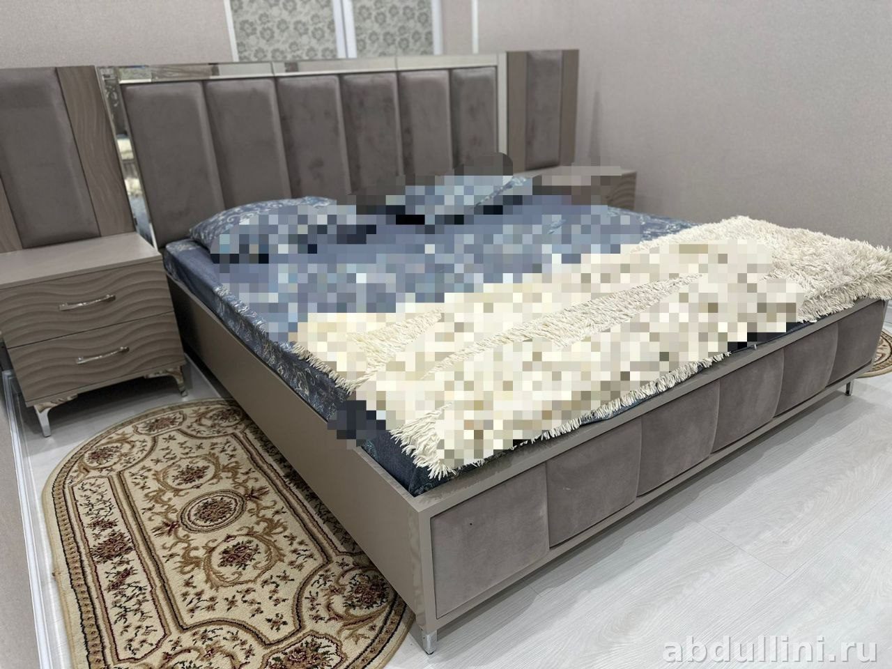 Кровать оснащена мягким изголовьем с вертикальными секциями и основанием с обивкой. Тумбочки и комод имеют фигурные фасады и металлические ножки. Шкаф-купе с зеркальными дверями добавляет пространства и легкости в интерьер.