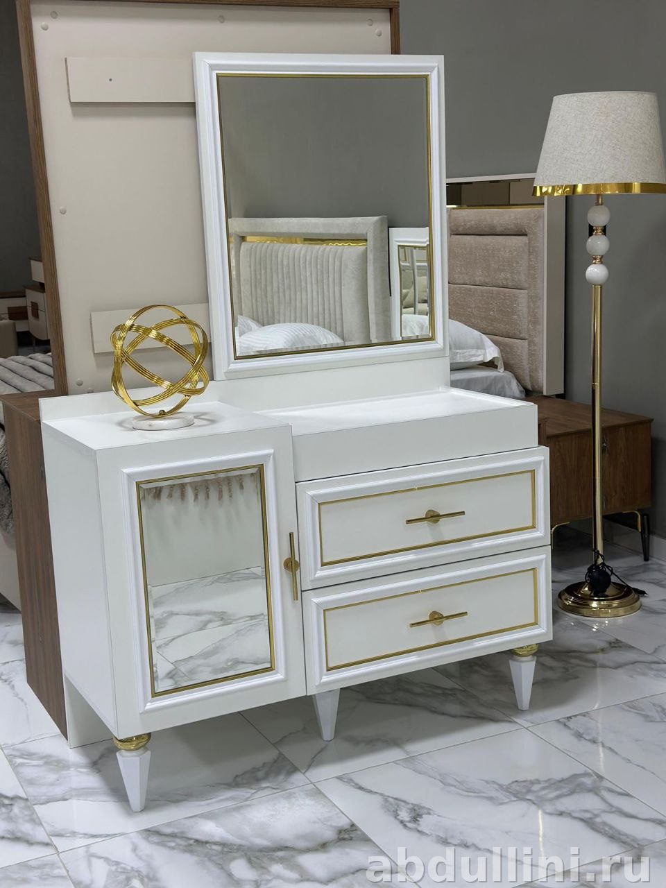 Готовый мебельный комплект для спальни в стиле неоклассика с золотистыми акцентами. Производство — Казахстан, качественные материалы и продуманная конструкция.