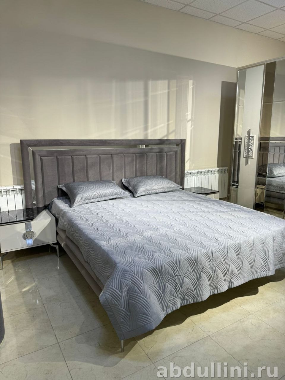 Комплект для спальни в современном стиле с элементами неоклассики. Включает кровать с мягким изголовьем и прикроватную тумбочку. Цветовая гамма — серый велюр и серебристые акценты.
