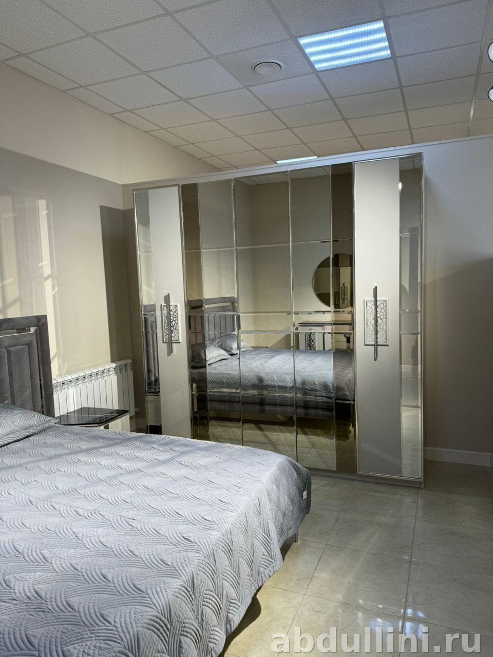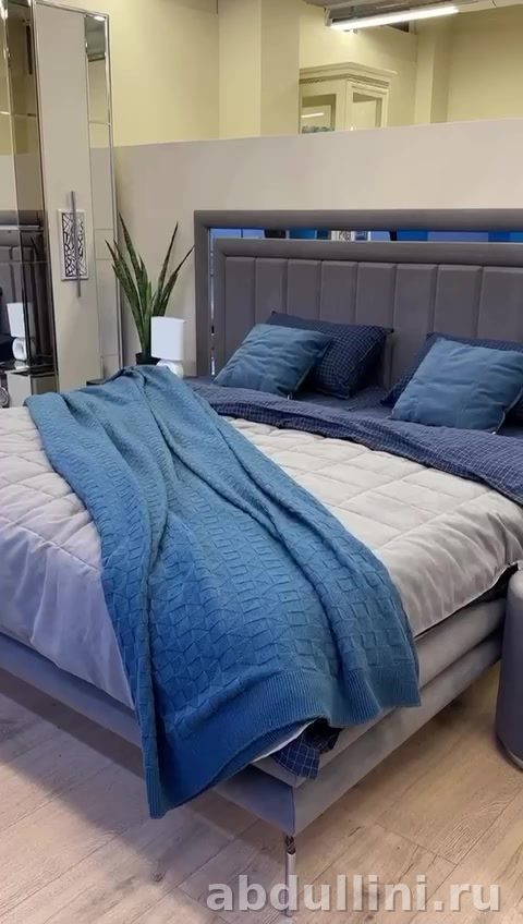 - Кровать: изголовье с горизонтальными полосами и глянцевой металлической рамкой. Основание на металлических ножках, ламели для поддержки матраса (матрас не входит). Обивка — серый велюр, каркас — ЛДСП/МДФ.