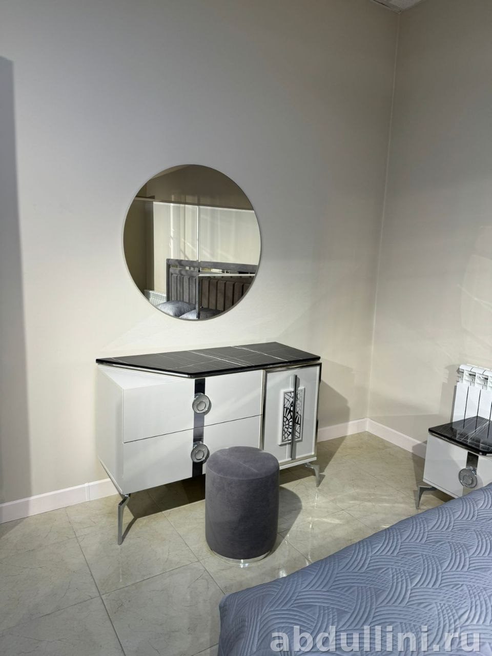 - Тумбочка: белый корпус с глянцевой черной столешницей, один выдвижной ящик и открытая ниша. Фурнитура хромированная.