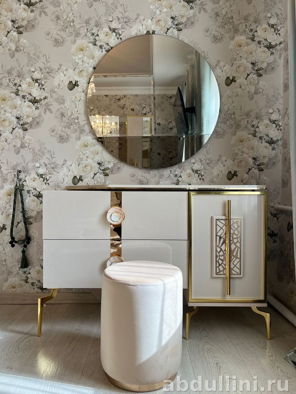 - Прикроватная тумбочка с корпусом кремового цвета и глянцевой отделкой. Столешница имитирует мрамор с золотистыми прожилками. Фурнитура золотистая.