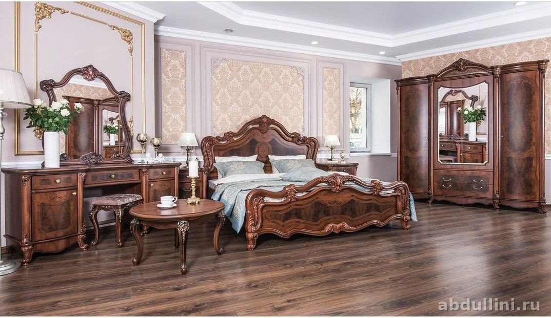 Готовый комплект для спальни из кровати, шкафа, тумбочек и туалетного столика. Цвет — насыщенный орех с глянцевой отделкой. Декоративные элементы с золотистыми акцентами.