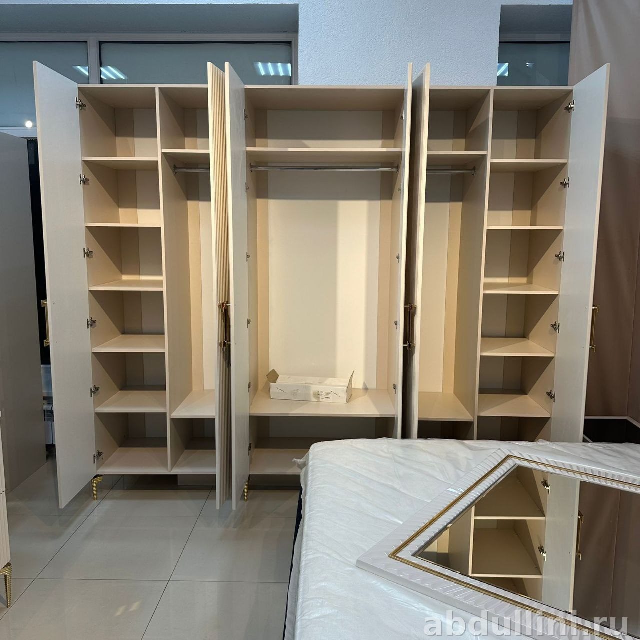 - В комплекте: шкаф (6 дверей), кровать 1.8 м, тумба, комод, зеркало