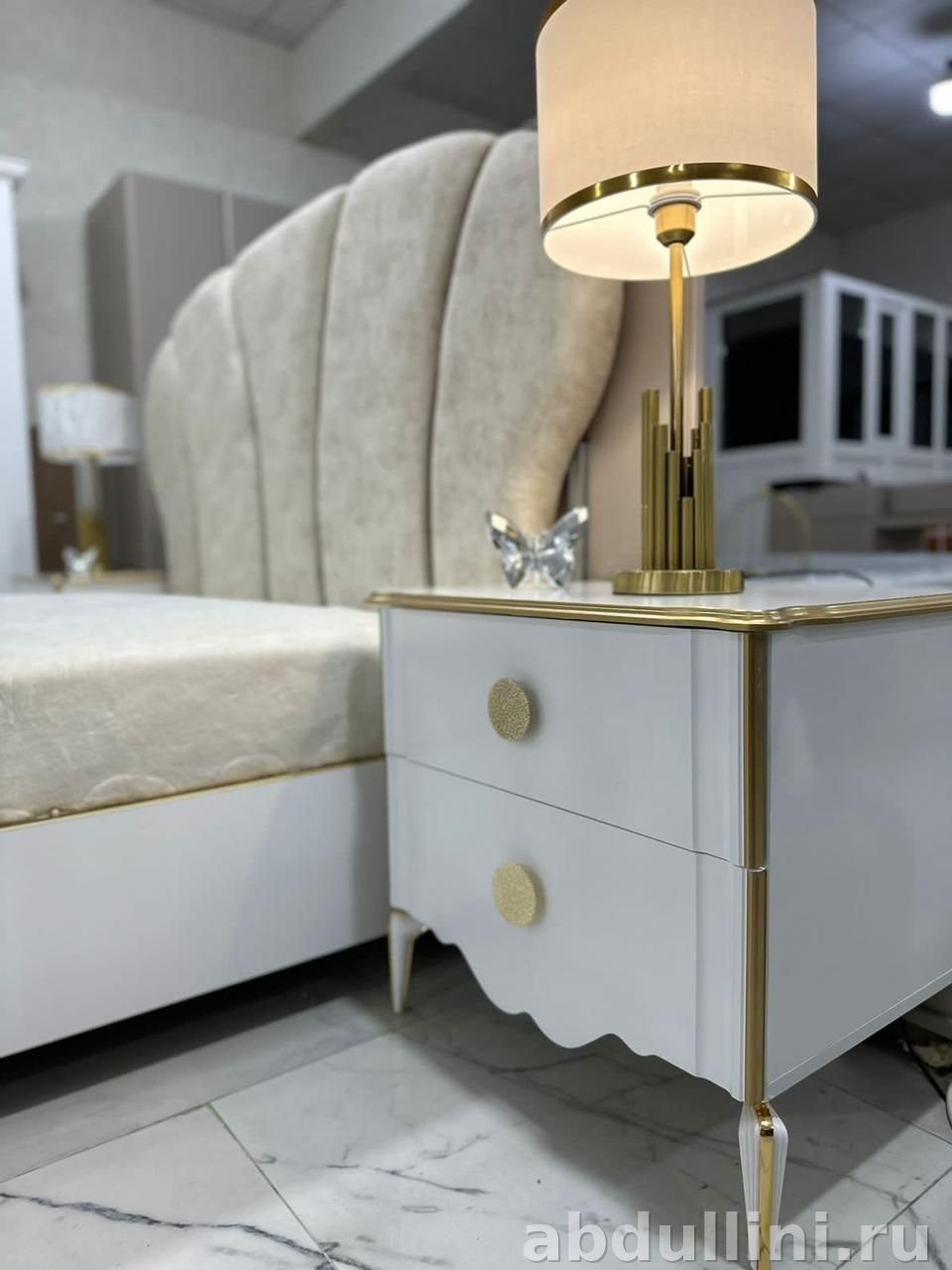 - Особенности: высокое изголовье кровати с полукруглой формой, сплошное основание с возможностью хранения, фигурные боковые панели тумбочек, круглые золотистые ручки.