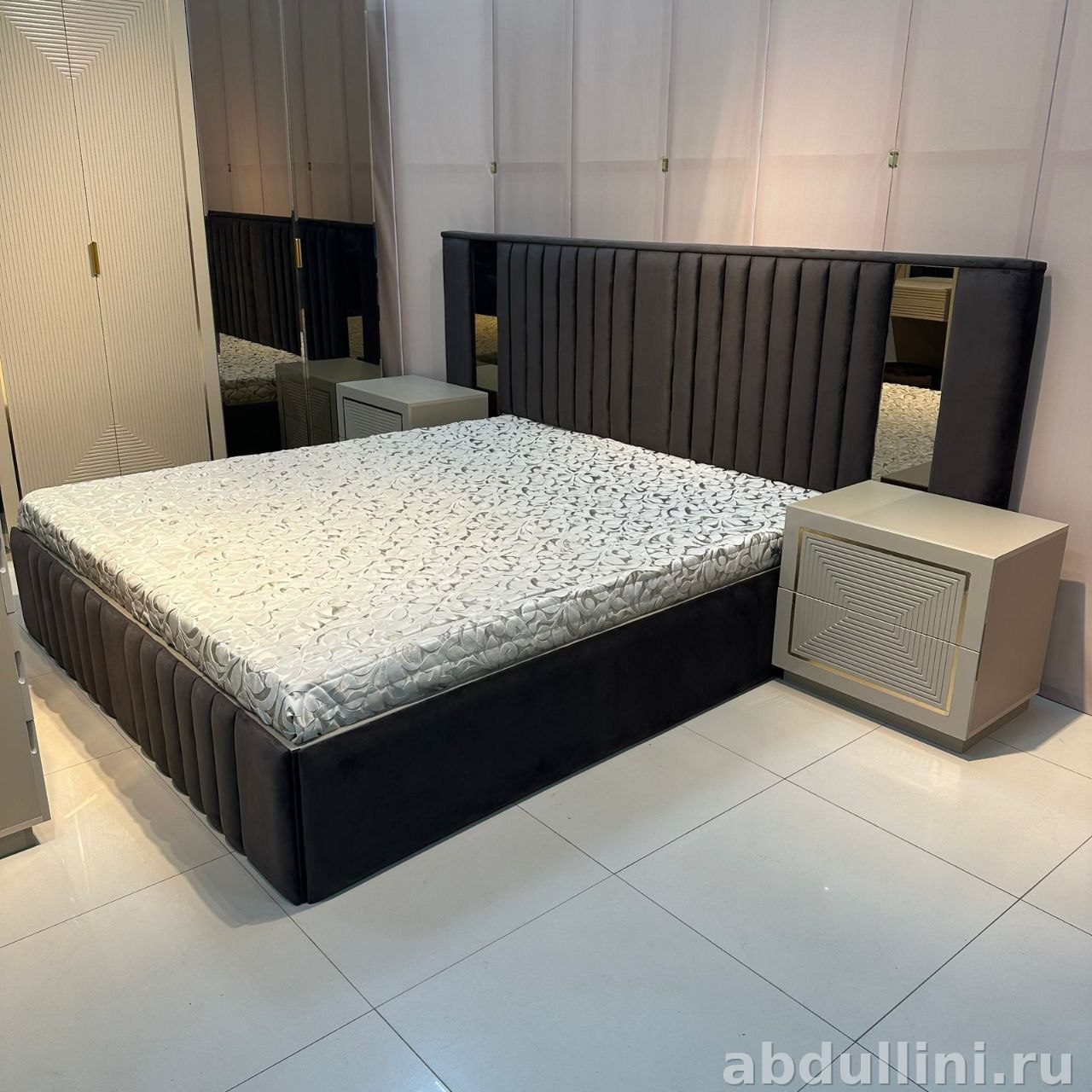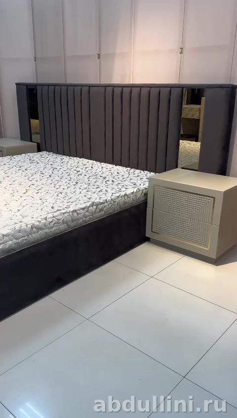 - Кровать: Размер 180/200 см, изголовье с вертикальной стежкой и зеркальными вставками, основание обито тканью в тон.