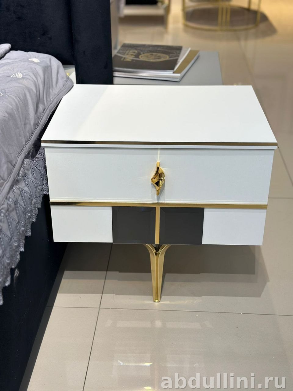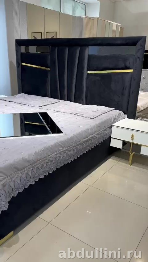 - Материалы: Корпус мебели — ЛДСП или МДФ с глянцевым покрытием. Обивка кровати — мягкая ткань (велюр или бархат). Фурнитура — металл с золотистым покрытием.