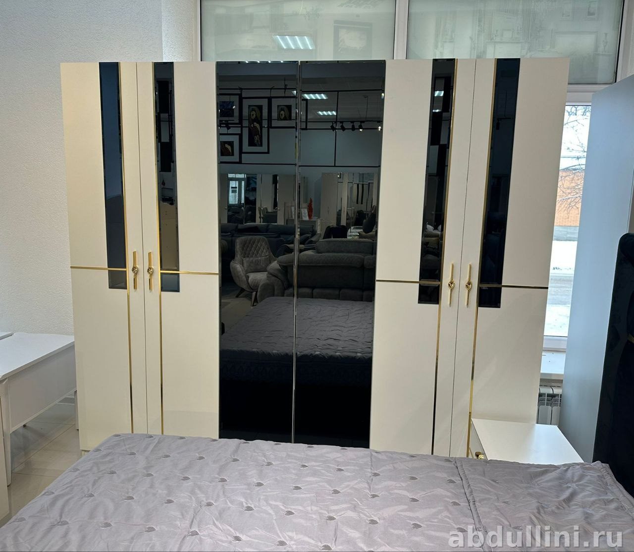 - Конструкция: Кровать с мягким изголовьем, тумбочки с выдвижными ящиками, комод с несколькими ящиками, шкаф с зеркальными дверцами и внутренними полками.