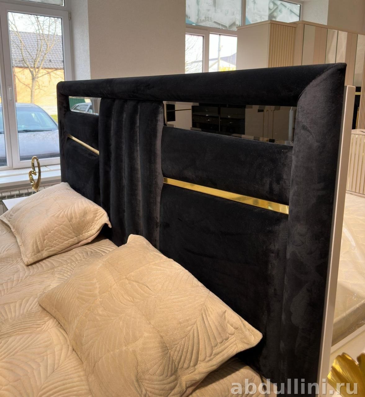- Кровать: двуспальная (180/200 см), высота спинки 140 см, ширина 212.5 см. Мягкое изголовье с золотистыми вставками.