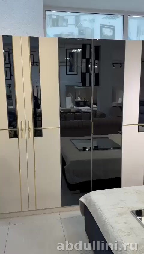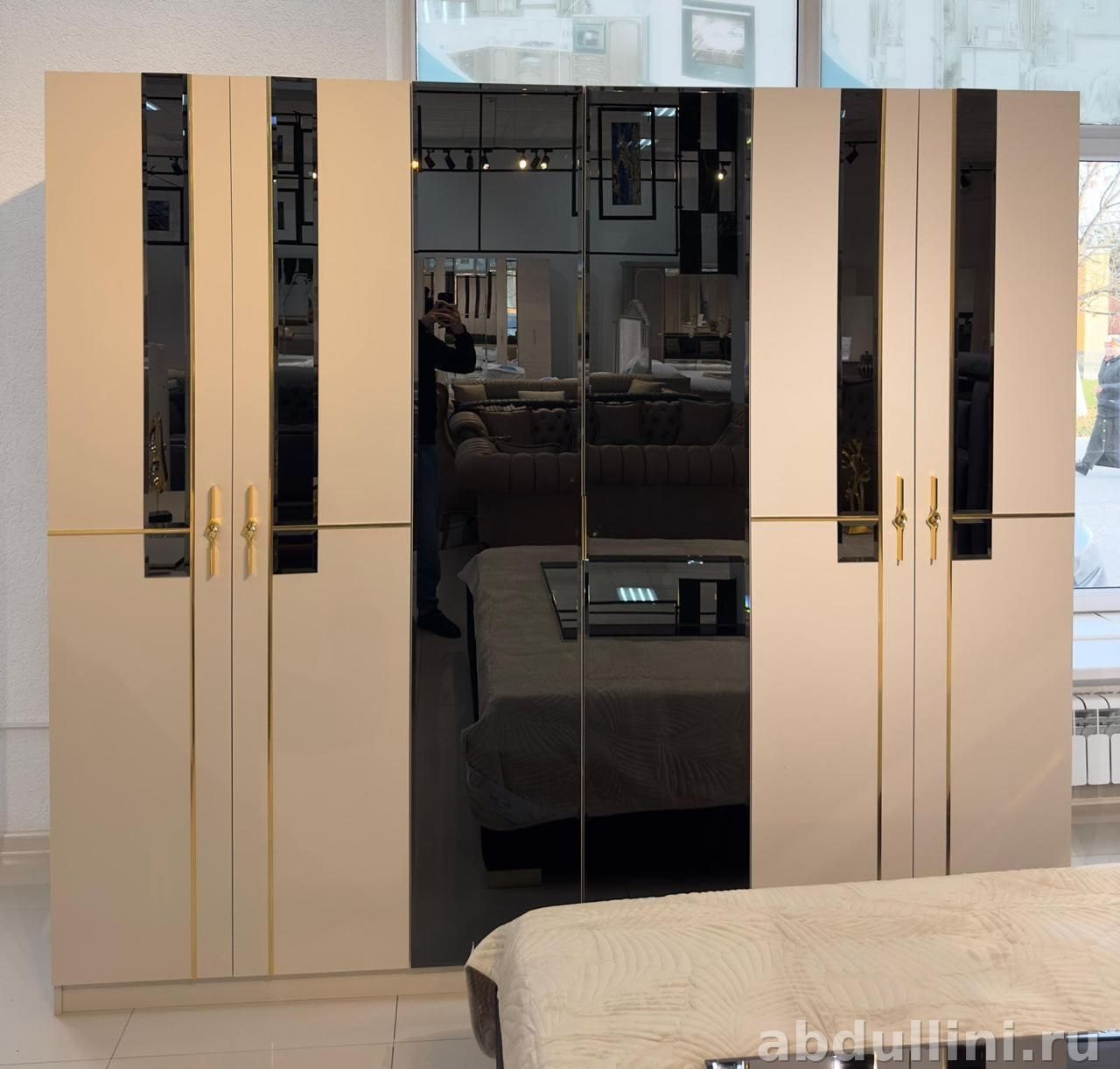 - Шкаф: 6 дверей, габариты 242×214×60 см. Вместительный, с зеркальными вставками и золотистой фурнитурой.