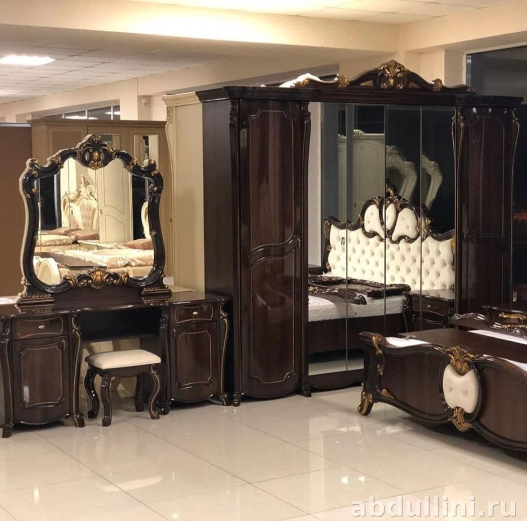 - Комплектация: кровать, две тумбочки, шкаф, туалетный столик с пуфиком.