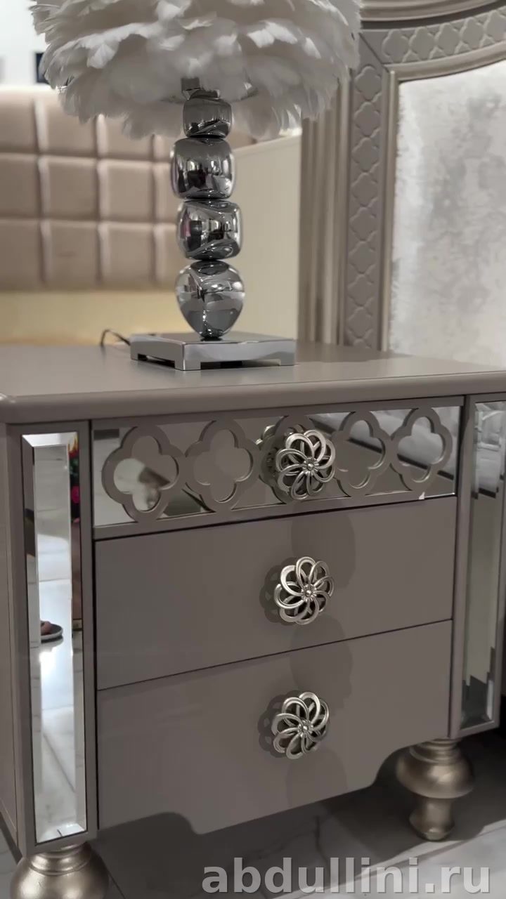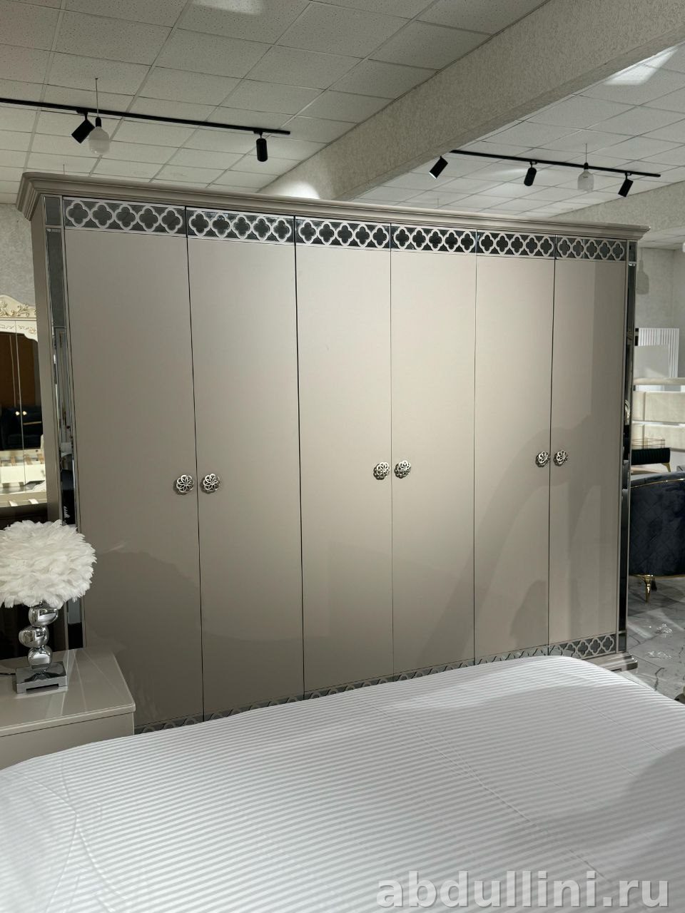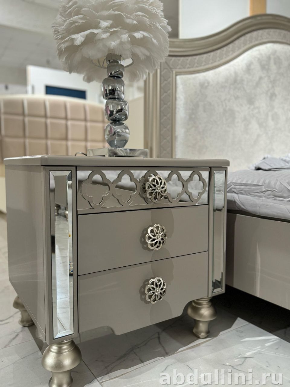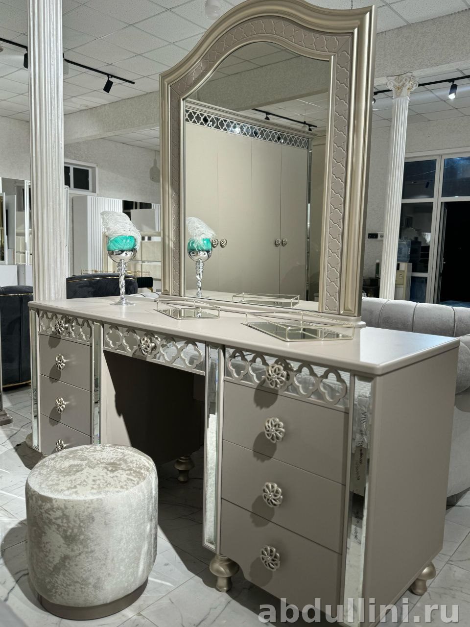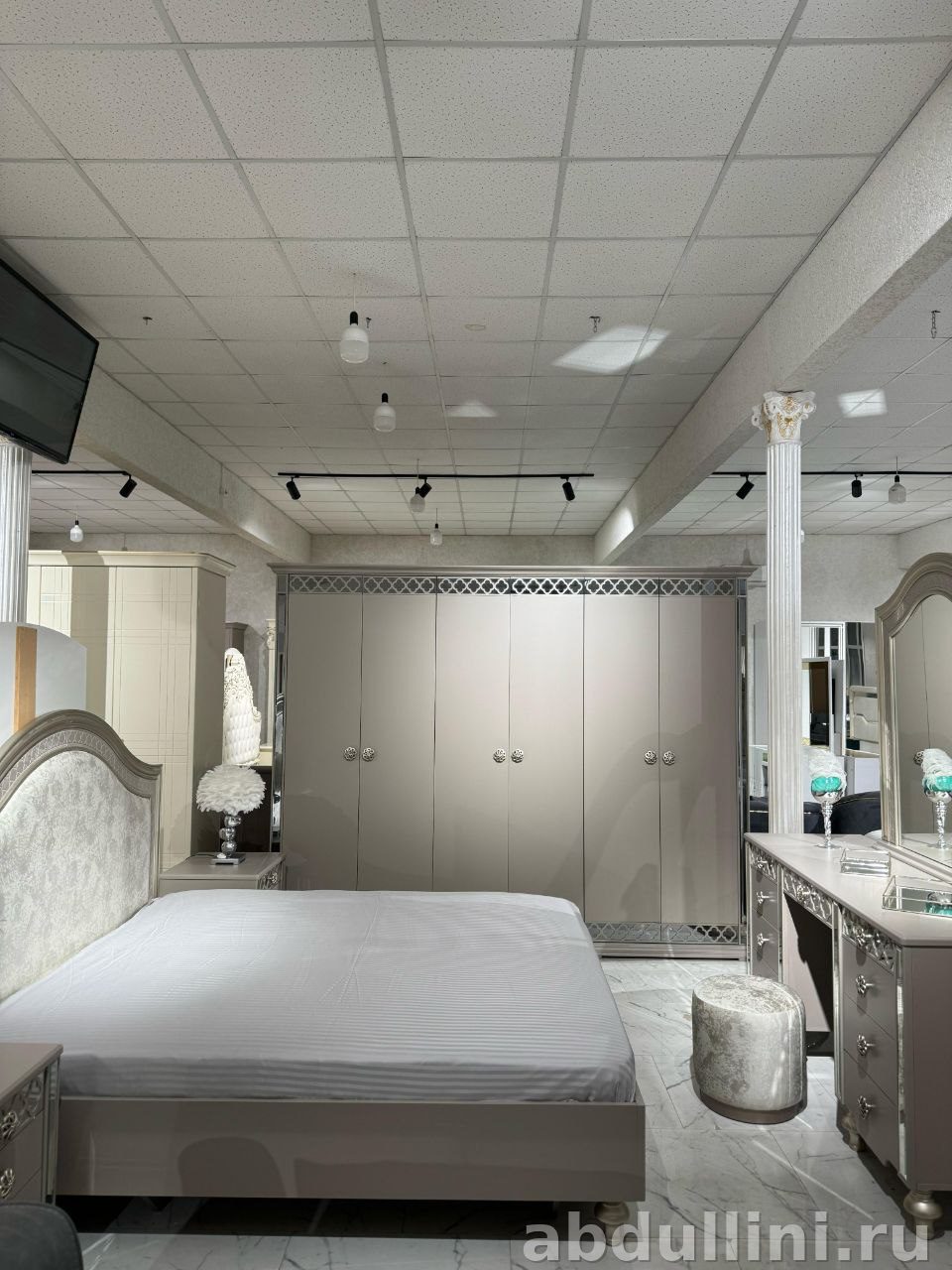 Готовый комплект мебели для спальни в стиле неоклассика с элементами гламура. Производство — фабрика в Ставрополе, материалы — МДФ и ЛДСП, покрытие — лак и эмаль. В комплекте кровать с велюровым изголовьем, две тумбочки, шкаф и туалетный столик с зеркалом и пуфом.