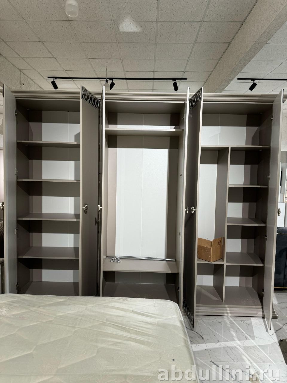 - Комплектация: кровать, 2 тумбочки, шкаф, столик с зеркалом, пуф