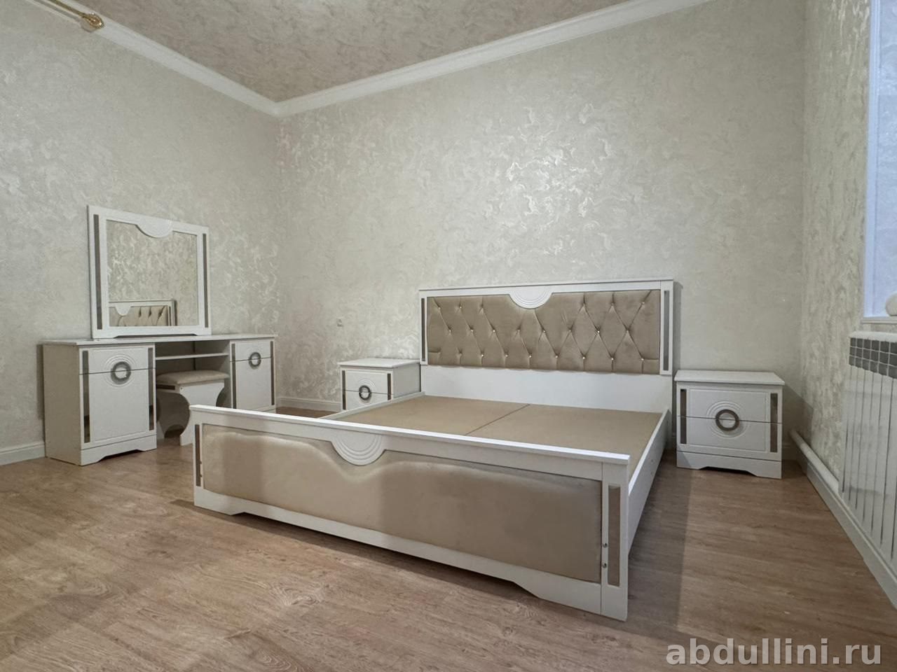 Комплект мебели для спальни Мая 2565 — это готовое решение для вашего интерьера. В комплект входит всё необходимое: кровать с мягким изголовьем и изножьем, две прикроватные тумбочки, туалетный столик с зеркалом и пуфик, а также вместительный шкаф для одежды. Цветовая гамма — светлый бежевый (близкий к слоновой кости) с серебристыми акцентами, что делает мебель универсальной для любого стиля.