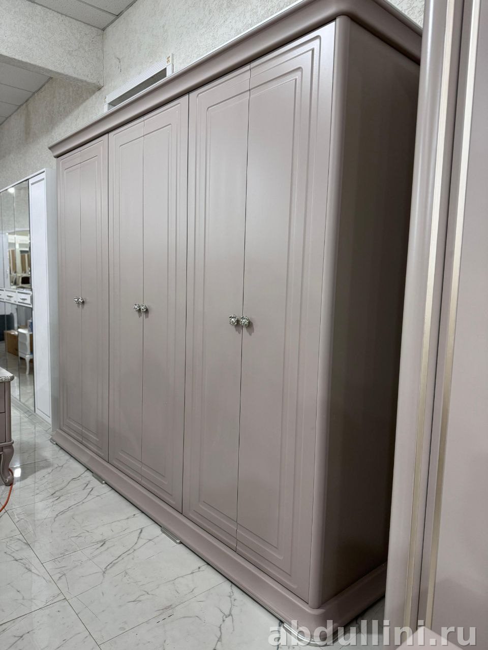 - Шкаф для одежды: четырёхстворчатый, с серебристой фурнитурой и аккуратными ручками.
