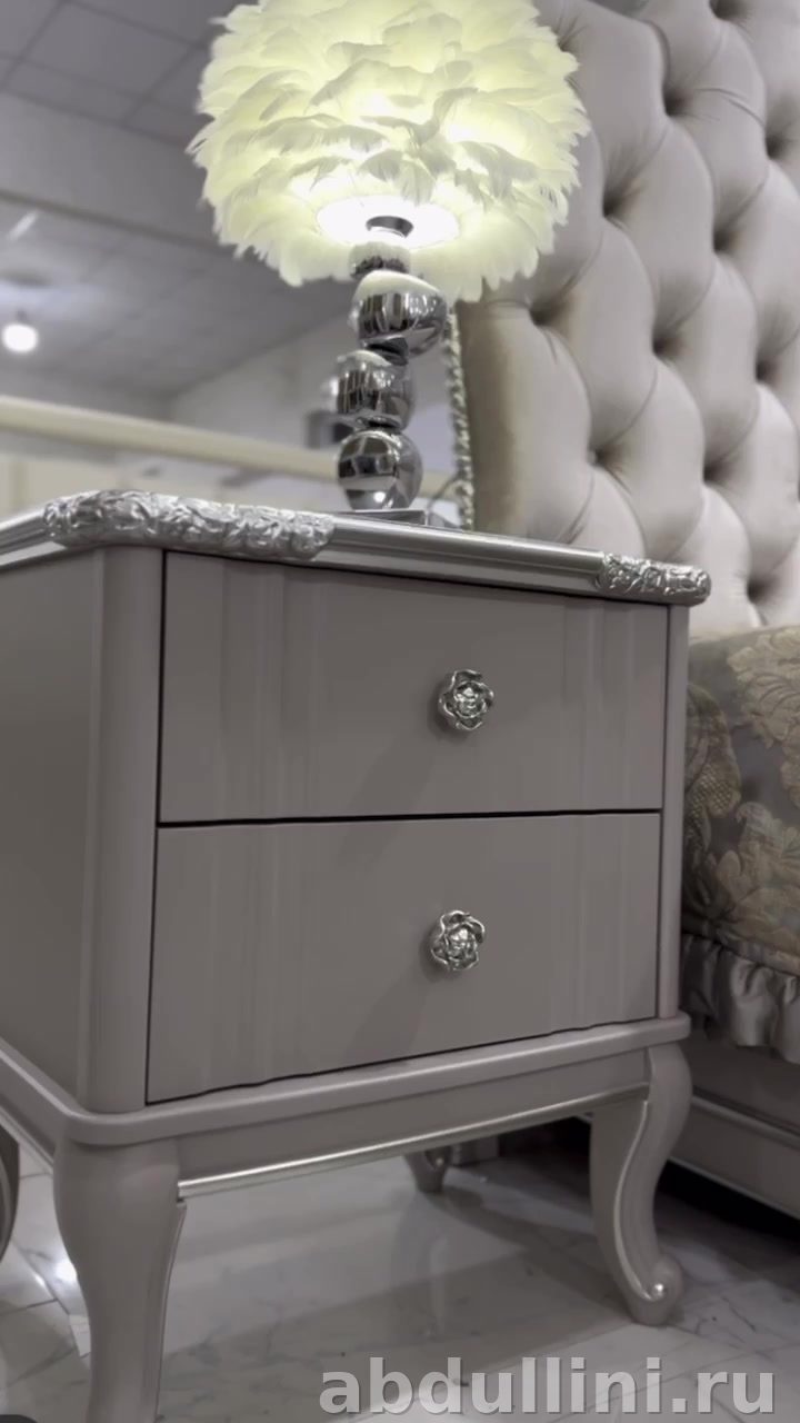 - Прикроватная тумбочка: два выдвижных ящика, изогнутые ножки, столешница с серебристой патиной.