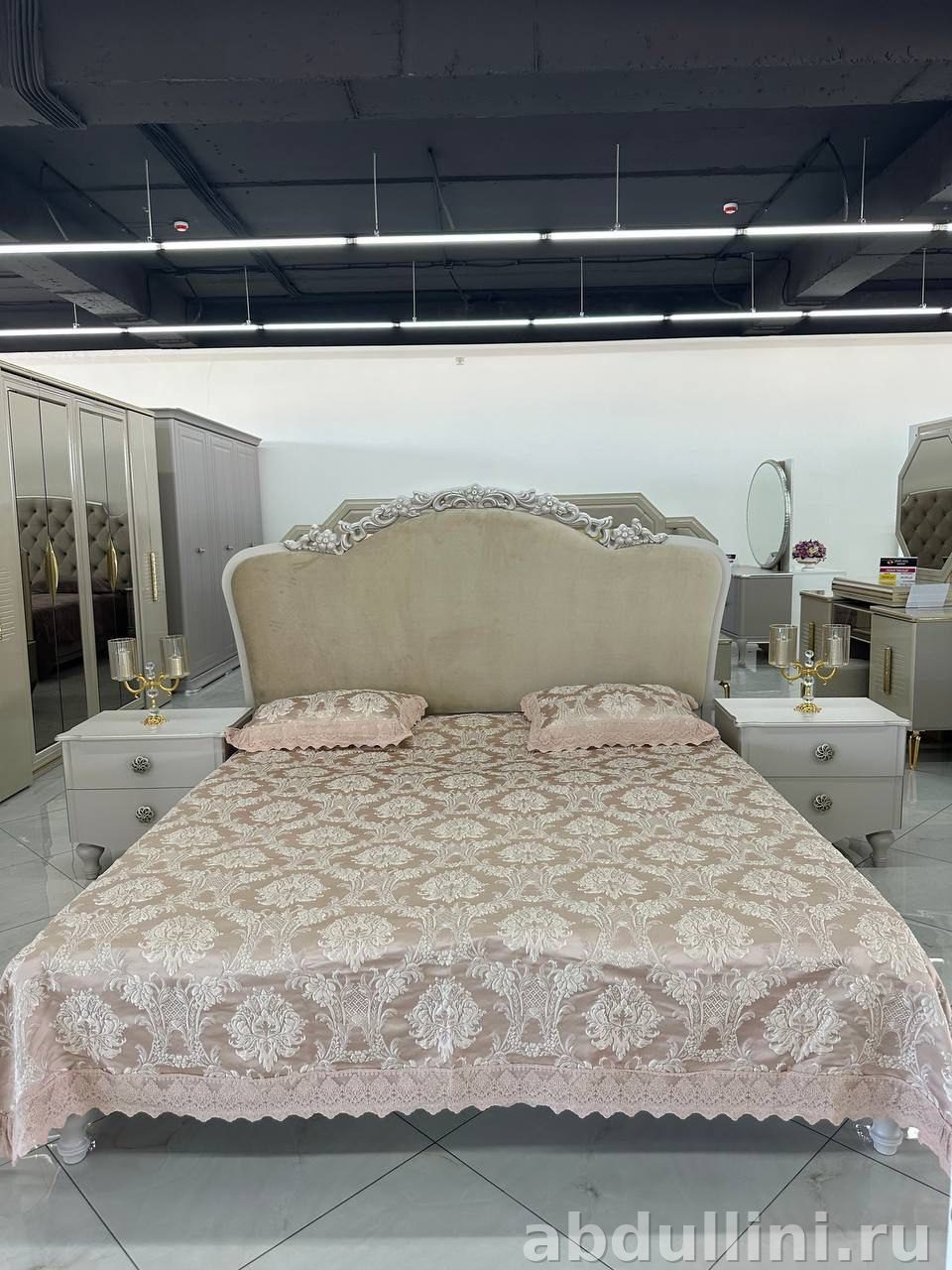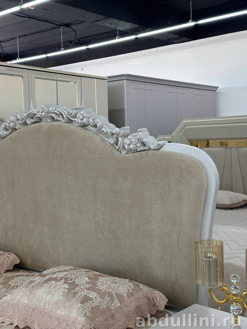 - Кровать: изголовье с декоративной резьбой, обивка — велюр или плотная ткань бежевого оттенка. Основание — светло-серое, с ламелями под матрас (матрас не входит в комплект).