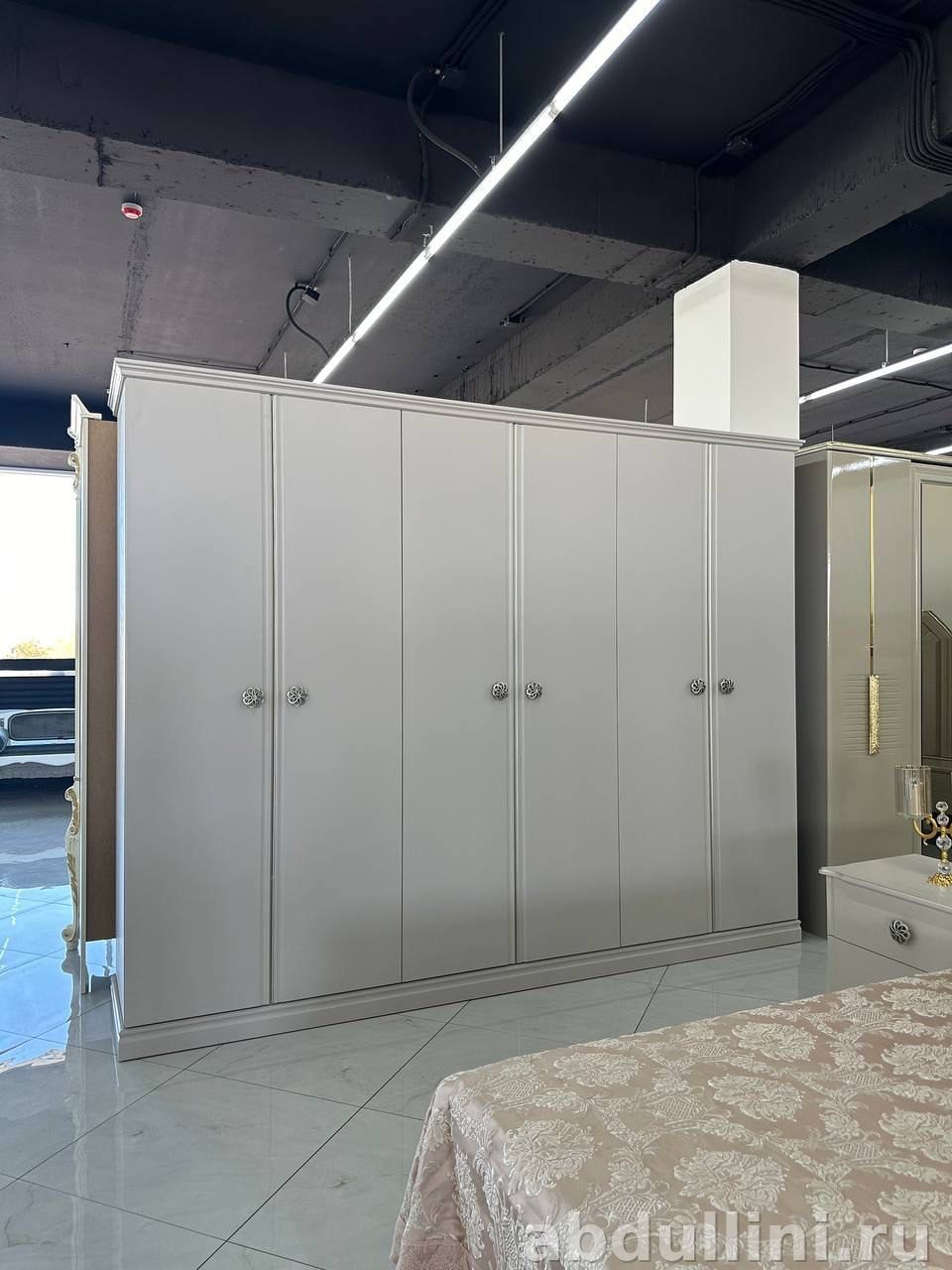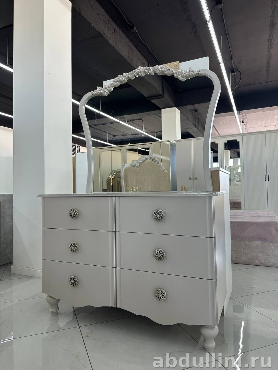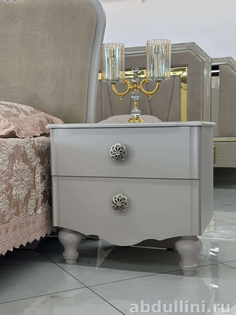 - Тумбочки: две штуки, светло-серые, матовые. По два выдвижных ящика с ручками-розетками серебристого цвета.