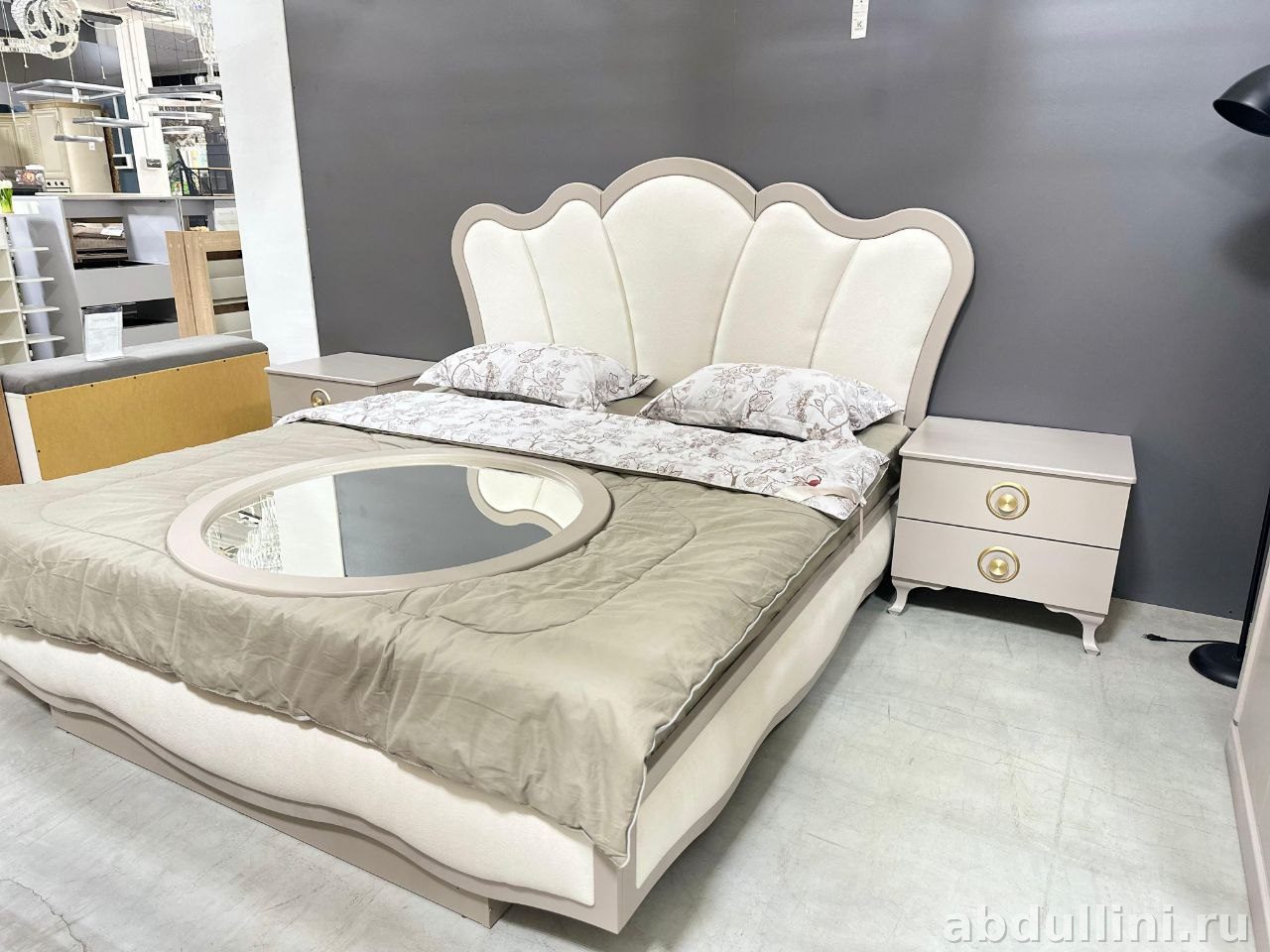 Комплект для спальни в мягких бежево-серых тонах с золотистыми акцентами. Включает кровать с фигурным изголовьем, шкаф с зеркальными дверцами, комод и тумбу. Цвет — латте (светлый беж с серой окантовкой).