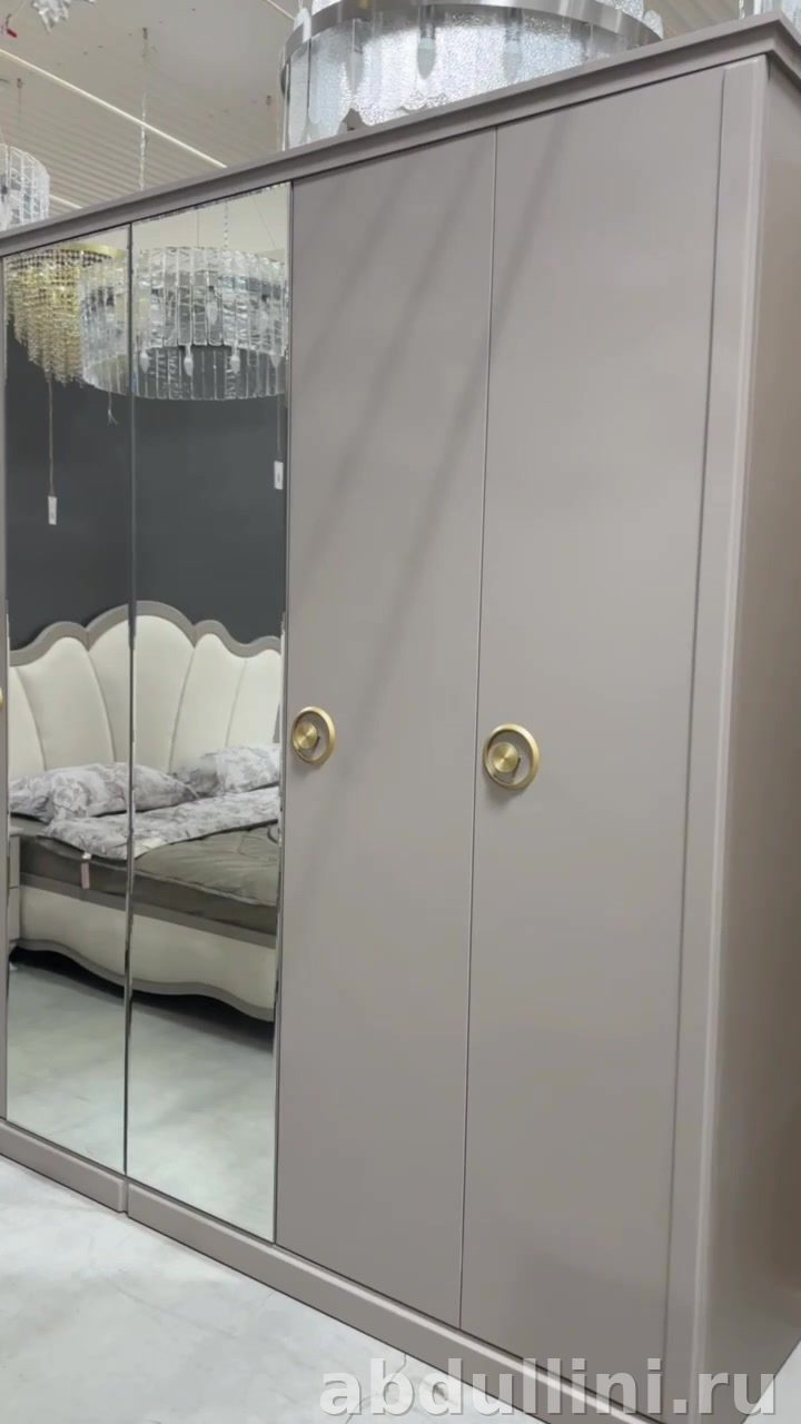 - Шкаф: высота 218 см, ширина 266 см, глубина 52.5 см. Зеркальные дверцы, золотистые ручки.