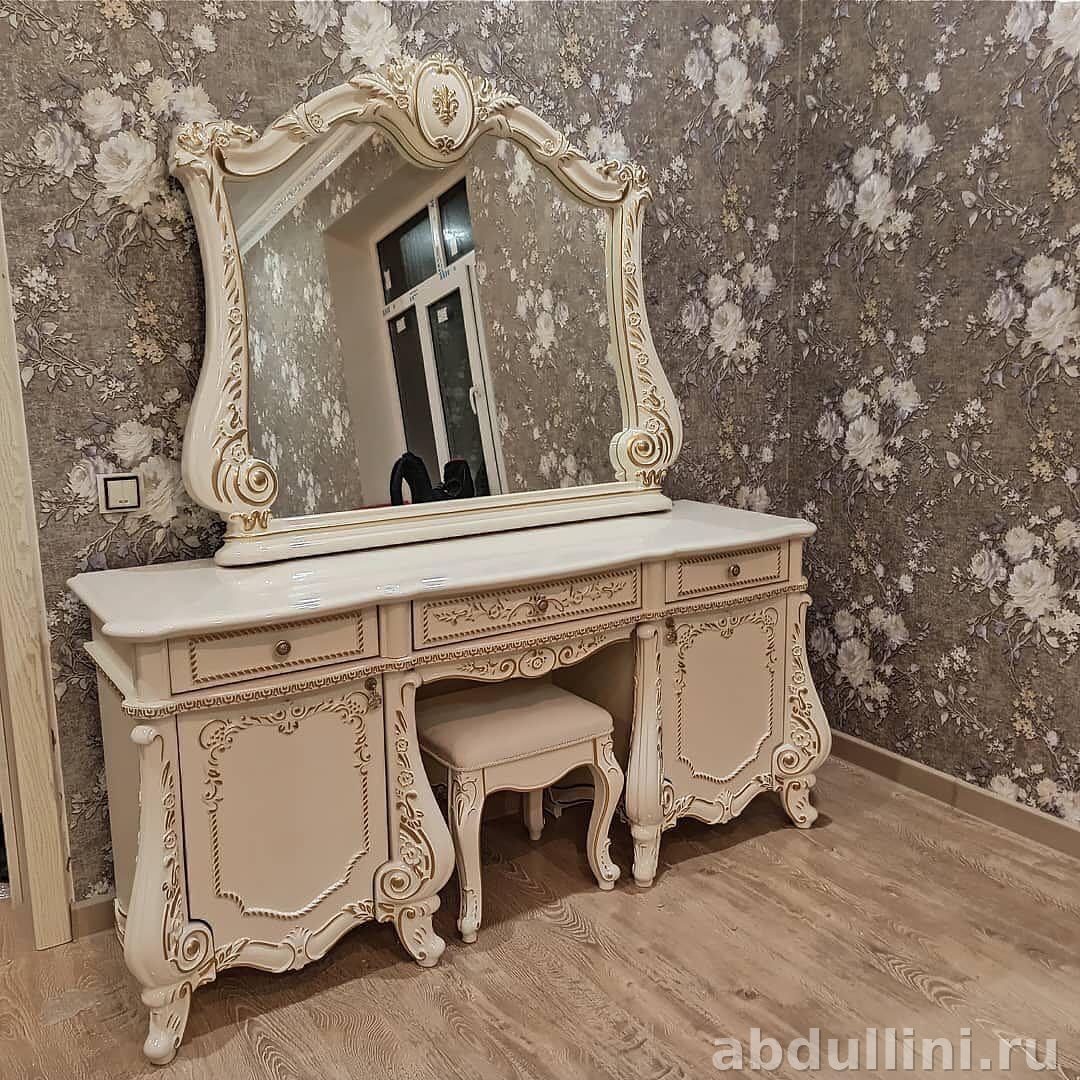 - Туалетный столик: С тремя выдвижными ящиками, двумя тумбами и зеркалом.