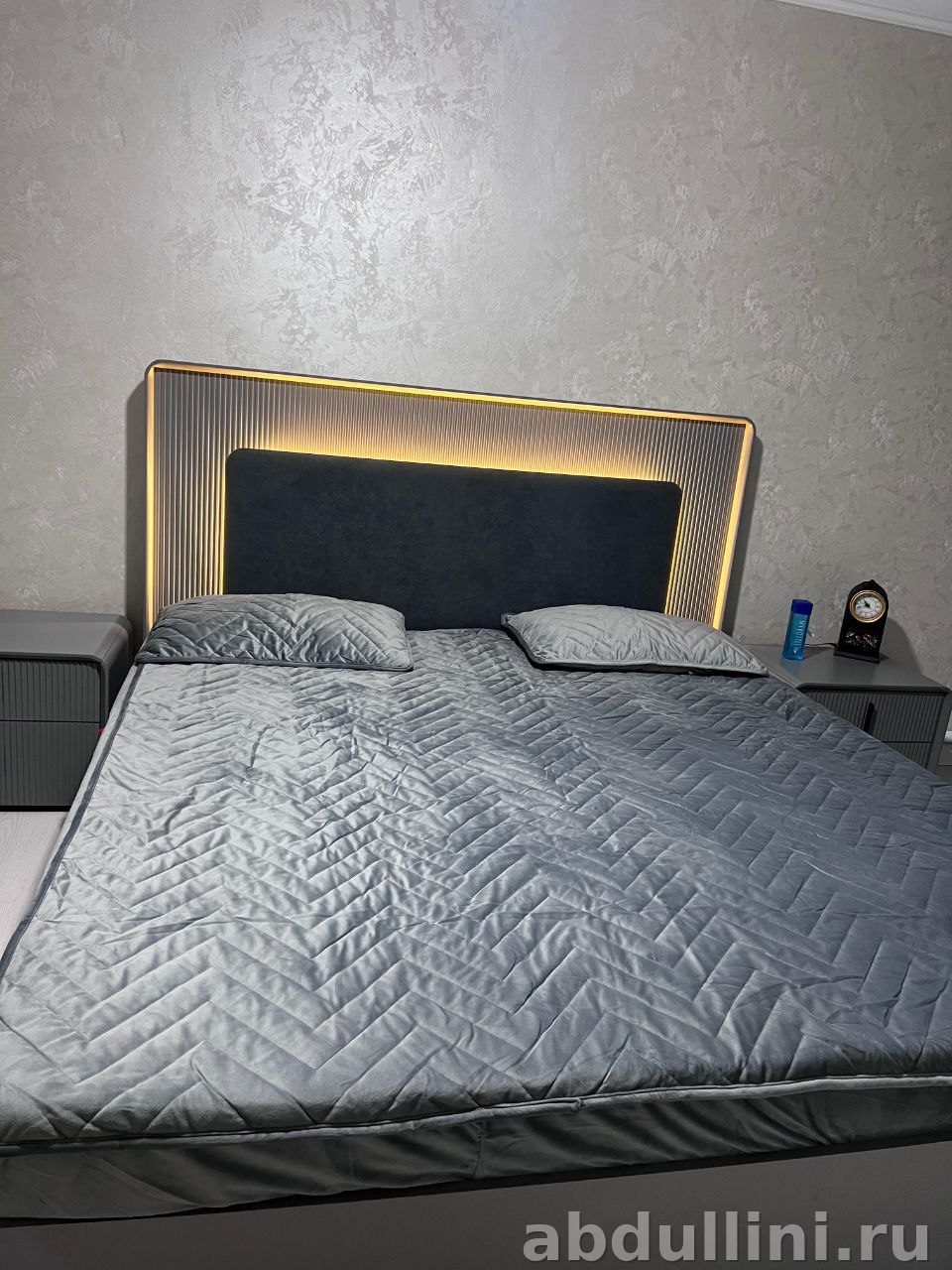 - Кровать 180×200 см — высокое изголовье с мягкой обивкой (ткань/экокожа), возможен подъемный механизм