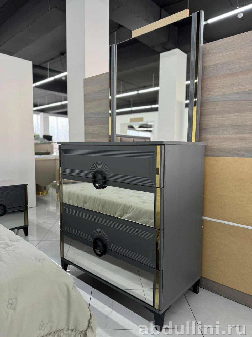 Комплект изготовлен из ЛДСП и МДФ, что обеспечивает долговечность и устойчивость к износу. Изголовье кровати обито мягкой тканью (велюр или бархат), а декоративные элементы выполнены из металла с золотистым покрытием. Комод дополнен зеркальными вставками на фасадах ящиков, что добавляет практичности и визуальной лёгкости.