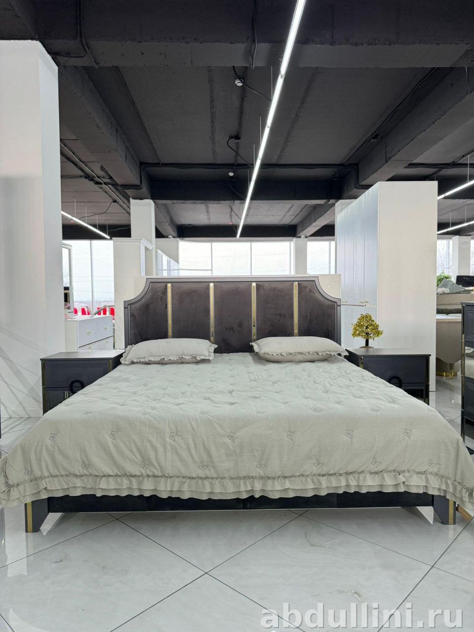 Спальня «Ника» от фабрики «21Век» — это готовое решение для вашего интерьера. Комплект включает кровать с мягким изголовьем и две прикроватные тумбочки. Основной цвет — графитовый, с золотистыми акцентами, что создает сдержанный и стильный образ.